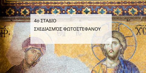 Αφού ολοκληρώσουμε τις διαδικασίες του χρυσώματος και προτού περάσουμε στο χρώμα, πρέπει να κατασκευάσουμε το φωτοστέφανο. Για να πετύχουμε τέλειο κύκλο γύρω από το πρόσωπο και πάνω στο χρυσό φόντο, θα χρησιμοποιήσουμε τον γραμμοσύρτη (ανταλλακτικό του διαβήτη για το χρώμα). Στο κέντρο του κύκλου τοποθετούμε το αιχμηρό μέρος του διαβήτη και ανοίγοντας το άλλο σκέλος που έχει τον γραμμοσύρτη, ελέγχουμε την απόσταση έτσι ώστε να απέχει εξίσου από τα τρία σημεία. Στη συνέχεια, με τη βοήθεια ενός μικρού πινέλου βάζουμε στον γραμμοσύρτη νερουλό χρώμα και σχηματίζουμε προσεκτικά την περιφέρεια του φωτοστέφανου.