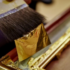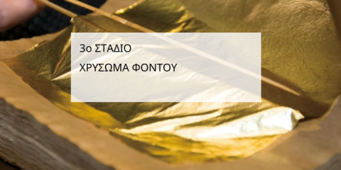 Αφού περάσουμε το σχέδιο στην προετοιμασμένη επιφάνεια και πριν ξεκινήσουμε την ζωγραφική συνίσταται να πραγματοποιήσουμε το χρύσωμα του φόντου. Αυτό γίνεται και για να αποφύγουμε ενδεχόμενο λέρωμα των ζωγραφισμένων μερών αν το χρύσωμα γίνει μετά τη ζωγραφική αλλά και γιατί θα είναι πιο εύκολο να ζωγραφίσουμε σωστά την εικόνα με το φόντο ήδη έτοιμο. Το φόντο το οποίο αποτελείται από τον ουρανό ( το φόντο πίσω από την απεικονιζουμενη μορφή) και το φωτοστέφανο καλύπτεται με φύλλα χρυσού τα οποία κολλώνται στην επιφάνεια με την κόλλα του μιξιόν. Σε ορισμένες περιπτώσεις, το χρύσωμα εφαρμόζεται επίσης σε ομοφόρια, πετραχήλια, σεβατέλια, ανταύγειες, καθώς και στις φτερούγες των αγγέλων, ως ερμηνεία της κατεύθυνσης του φωτός.