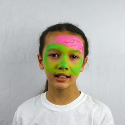 Βήμα 2: Χρησιμοποιώντας ένα σφουγγαράκι, απλώστε το πράσινο λάιμ στο κέντρο του προσώπου και το απαλό ροζ στο πλάι του μετώπου, αποφεύγοντας τα μάτια και το στόμα.