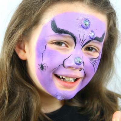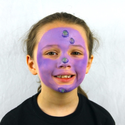 Βήμα 2: Χρησιμοποιώντας λιλά χρώμα και ένα σφουγγάρι, απλώστε το χρώμα σε όλο το πρόσωπο, αποφεύγοντας τα μάτια και το στόμα.