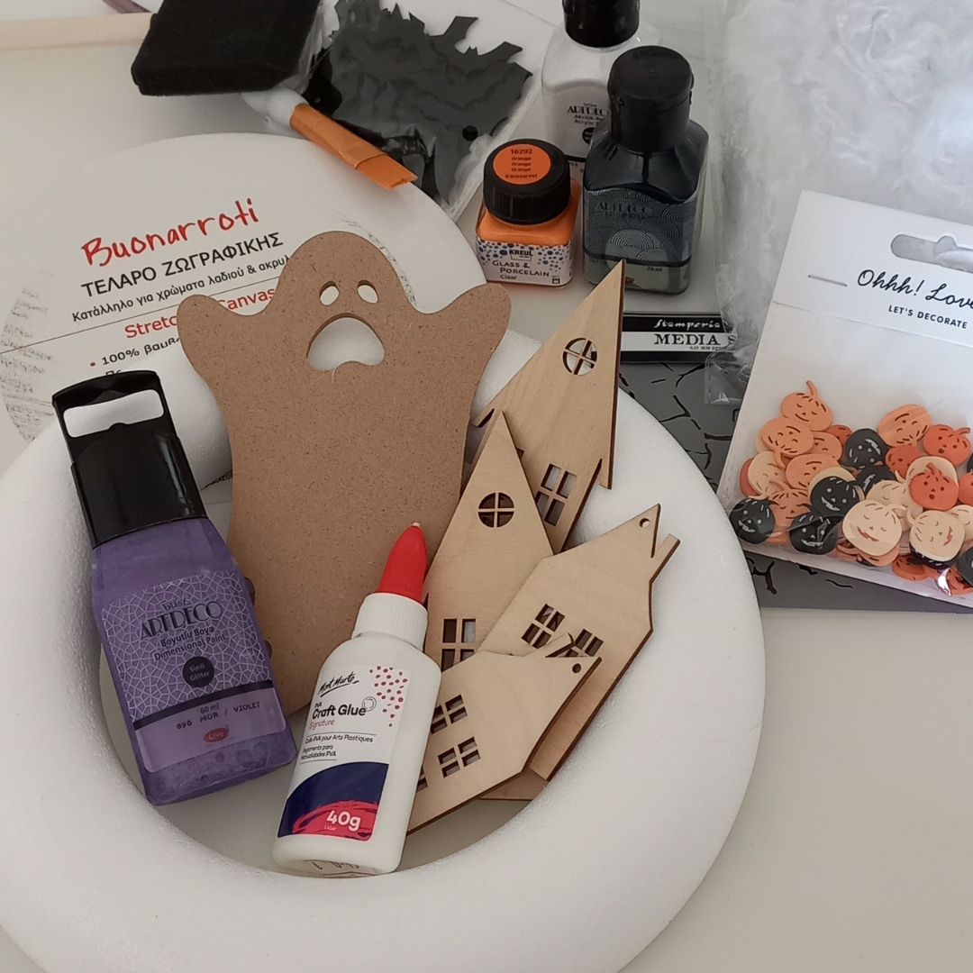 Βάψτε την πίσω πλευρά του στεφανιού με το πορτοκαλί χρώμα και την μπροστινή με μαύρο. Με το ίδιο μαύρο χρώμα, περάστε και το στρογγυλό τελάρο, καθώς και τα ξύλινα σπιτάκια. Το φάντασμα βάψτε το λευκό, θα δώσει την τέλεια αντίθεση στο σύνολο.
