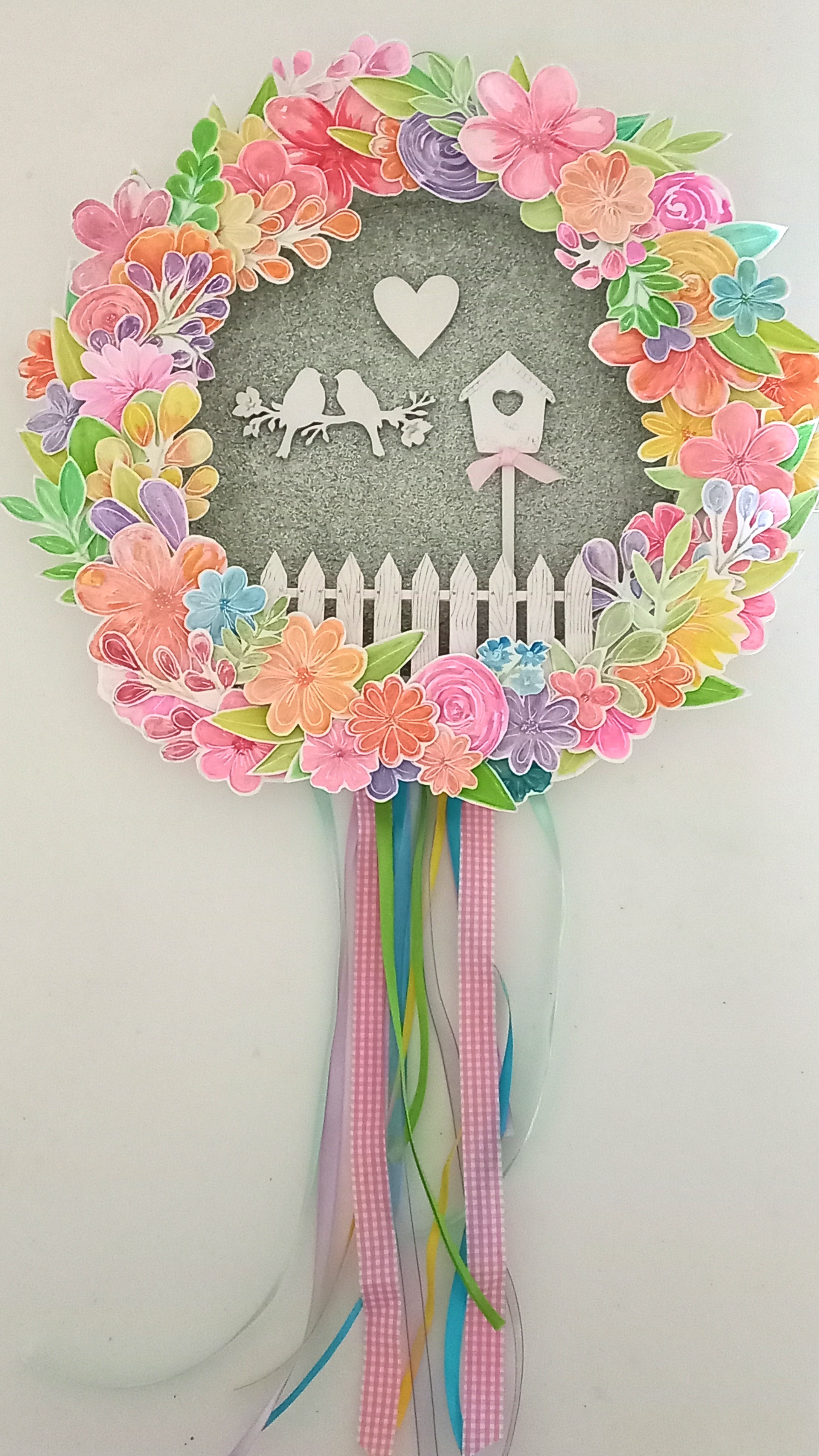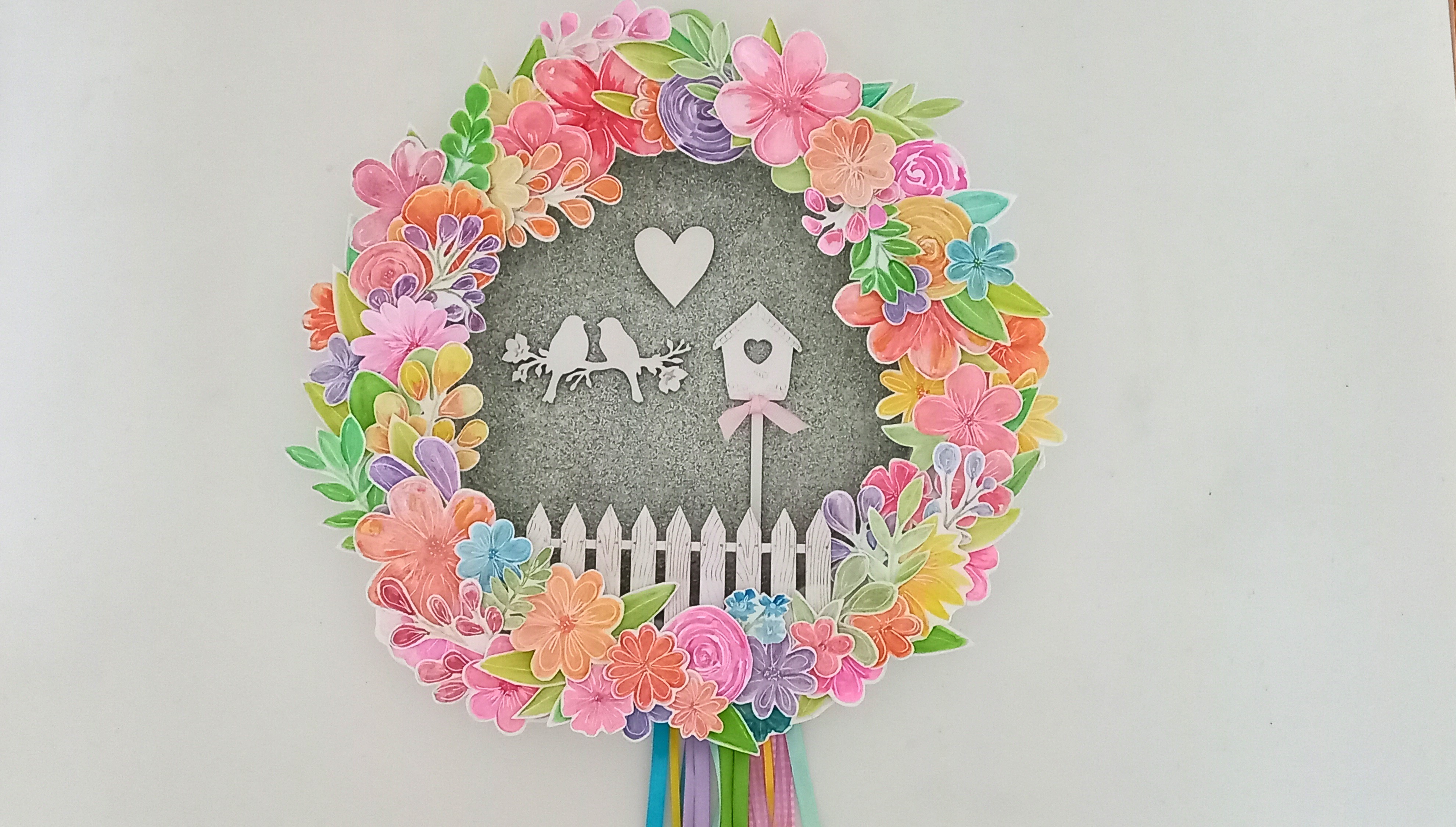 Τέλος, κολλήστε τα φύλλα και τα λουλούδια στο τελάρο, σχηματίζοντας ένα όμορφο και φωτεινό ανοιξιάτικο στεφάνι.