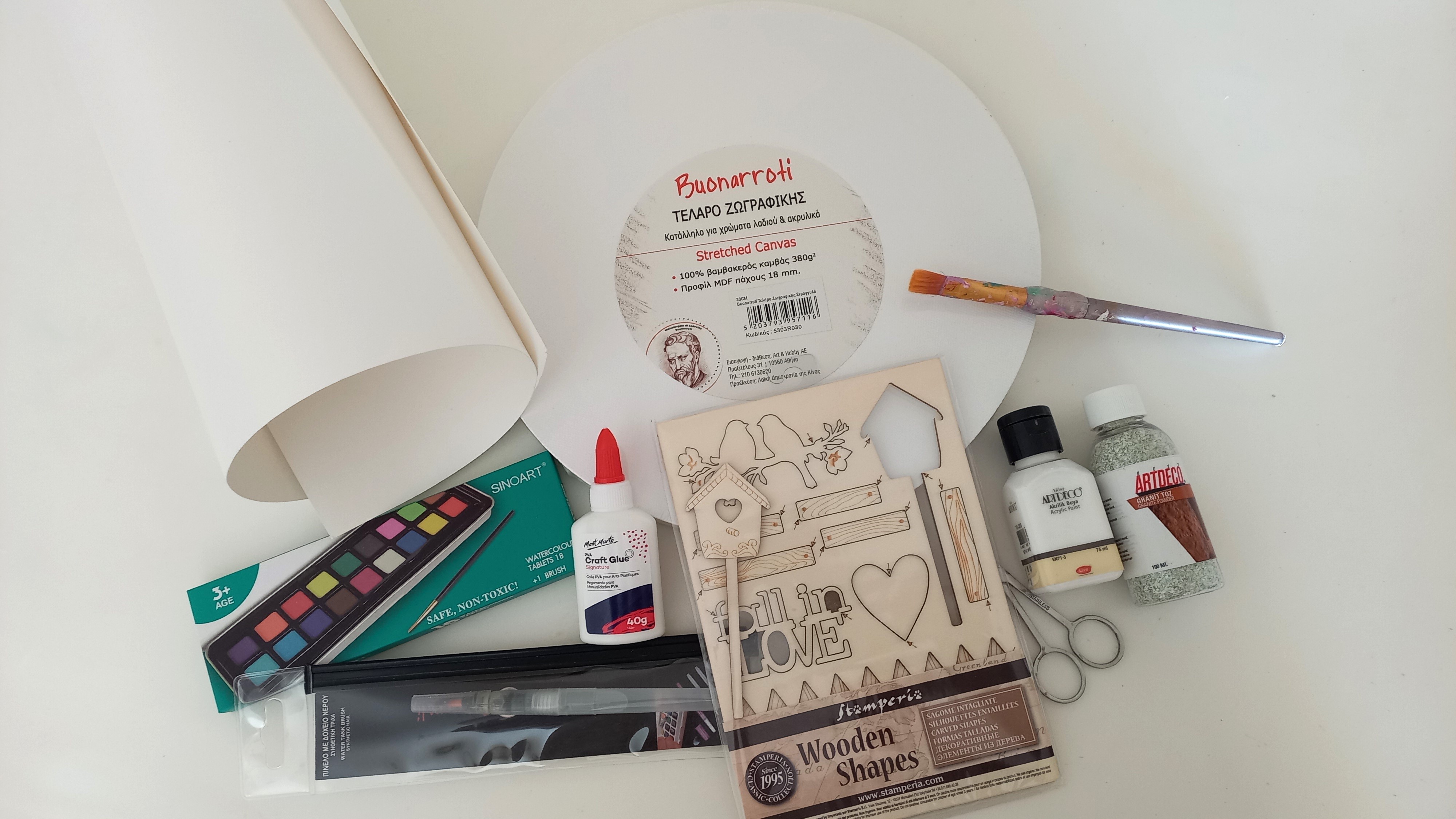 Αρχίστε χρωματίζοντας την ξύλινη επιφάνεια του τελάρου και τα ξύλινα διακοσμητικά με λευκό ακρυλικό χρώμα.