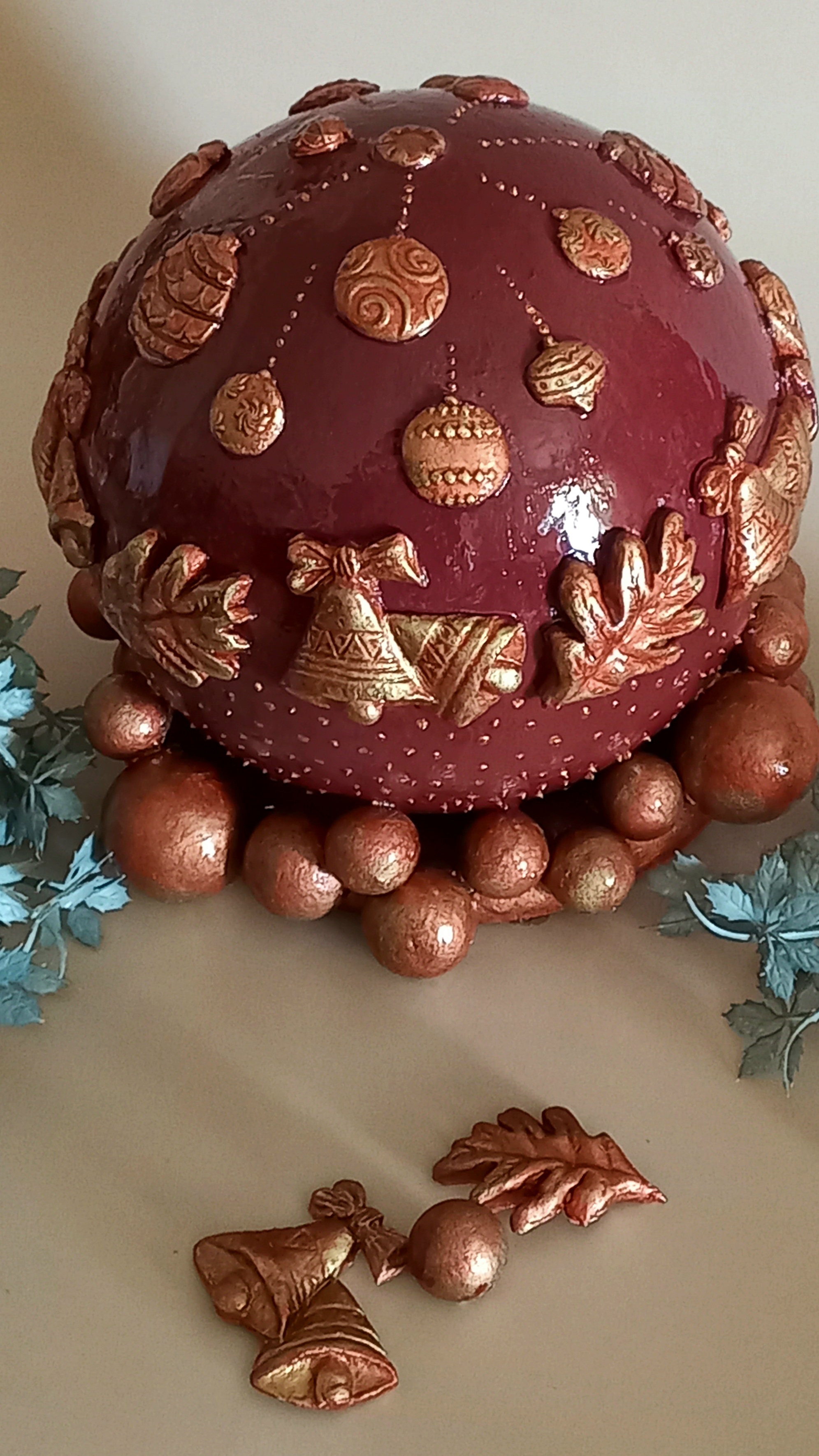 Αυτή η εντυπωσιακή διακοσμητική μπάλα, βαμμένη σε βαθύ μπορντό και στολισμένη με χρυσές λεπτομέρειες, συνδυάζει παραδοσιακή κομψότητα με καλλιτεχνική διάθεση. Ένα project που αποπνέει τη ζεστασιά και τη λάμψη των Χριστουγέννων, φτιαγμένο εξ ολοκλήρου στο χέρι!