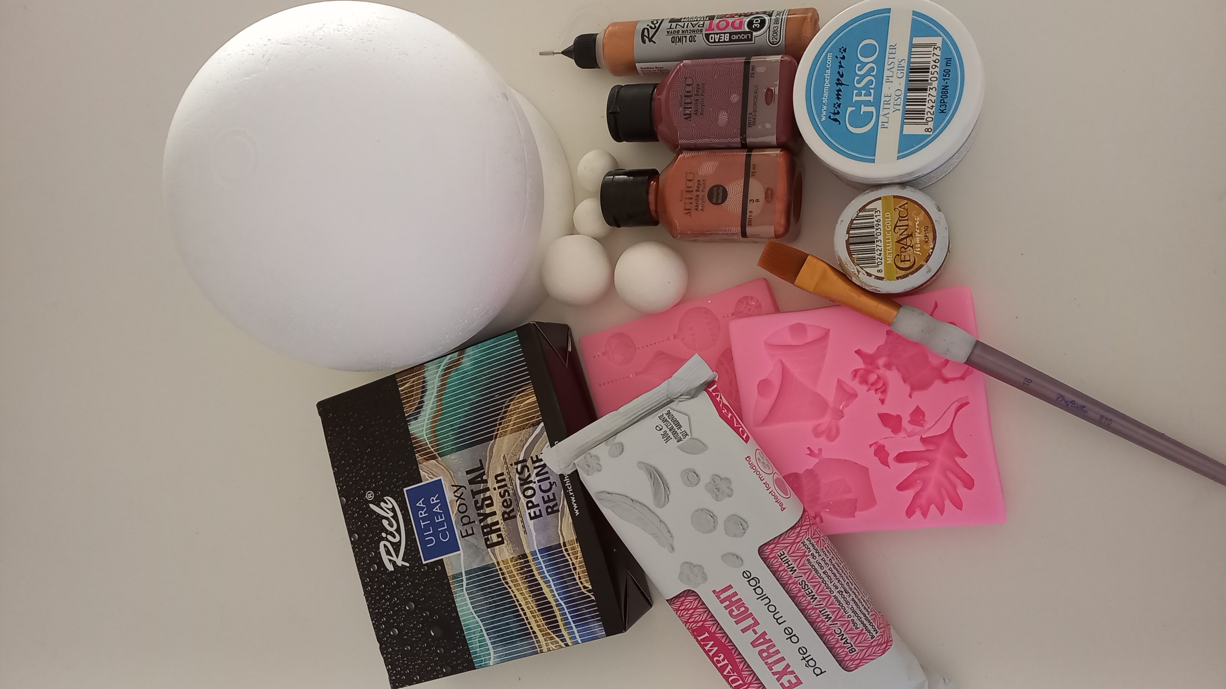 Χρησιμοποιήστε τα καλούπια σιλικόνης για να φτιάξετε τα ανάγλυφα σχήματα από πηλό extra light. Εφαρμόστε τα πάνω στην μπάλα, ώστε να πάρουν την επιθυμητή κλίση και στη συνέχεια τοποθετήστε τα προσεκτικά σε επίπεδη επιφάνεια για να στεγνώσουν.