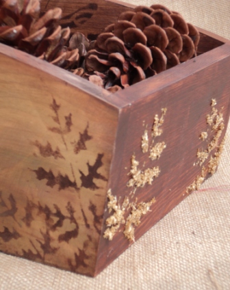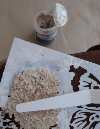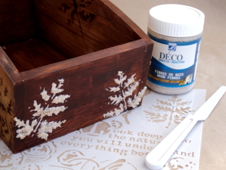 4 – Τοποθετούμε και πάλι το στένσιλ πάνω σε κάποια από τα φύλλα στο εξωτερικό του κουτιού. Με τη βοήθεια της σπάτουλας εφαρμόζουμε μια στρώση από την πάστα με τις ίνες ξύλου και την αφήνουμε να στεγνώσει, αφού ανασηκώσουμε προσεχτικά το στένσιλ.
