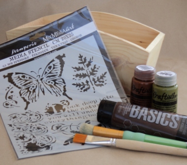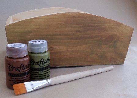 1 – Χρησιμοποιώντας ταυτόχρονα τα δυο ακρυλικά χρώματα Craftistico (Maroon και Cambo Green), βάφουμε εξωτερικά τις δύο μεγαλύτερες επιφάνειες του καλαθιού. Φροντίζουμε το πινέλο μας να έχει αρκετό νερό, ώστε να βγαίνει σχεδόν διάφανο το χρώμα και να είναι ευδιάκριτα τα νερά του ξύλου.