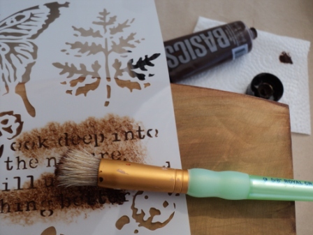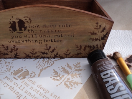 3 – Με το σκληρό πινέλο-σφουγγάρι και λίγο από το ακρυλικό χρώμα Burnt Umber, αποτυπώνουμε ταμποναριστά το σχέδιο με το φύλλο από το στένσιλ σε διάφορα σημεία, στις δύο μεγαλύτερες πλευρές του καλαθιού, αλλού πιο έντονα και αλλού πιο αχνά.
