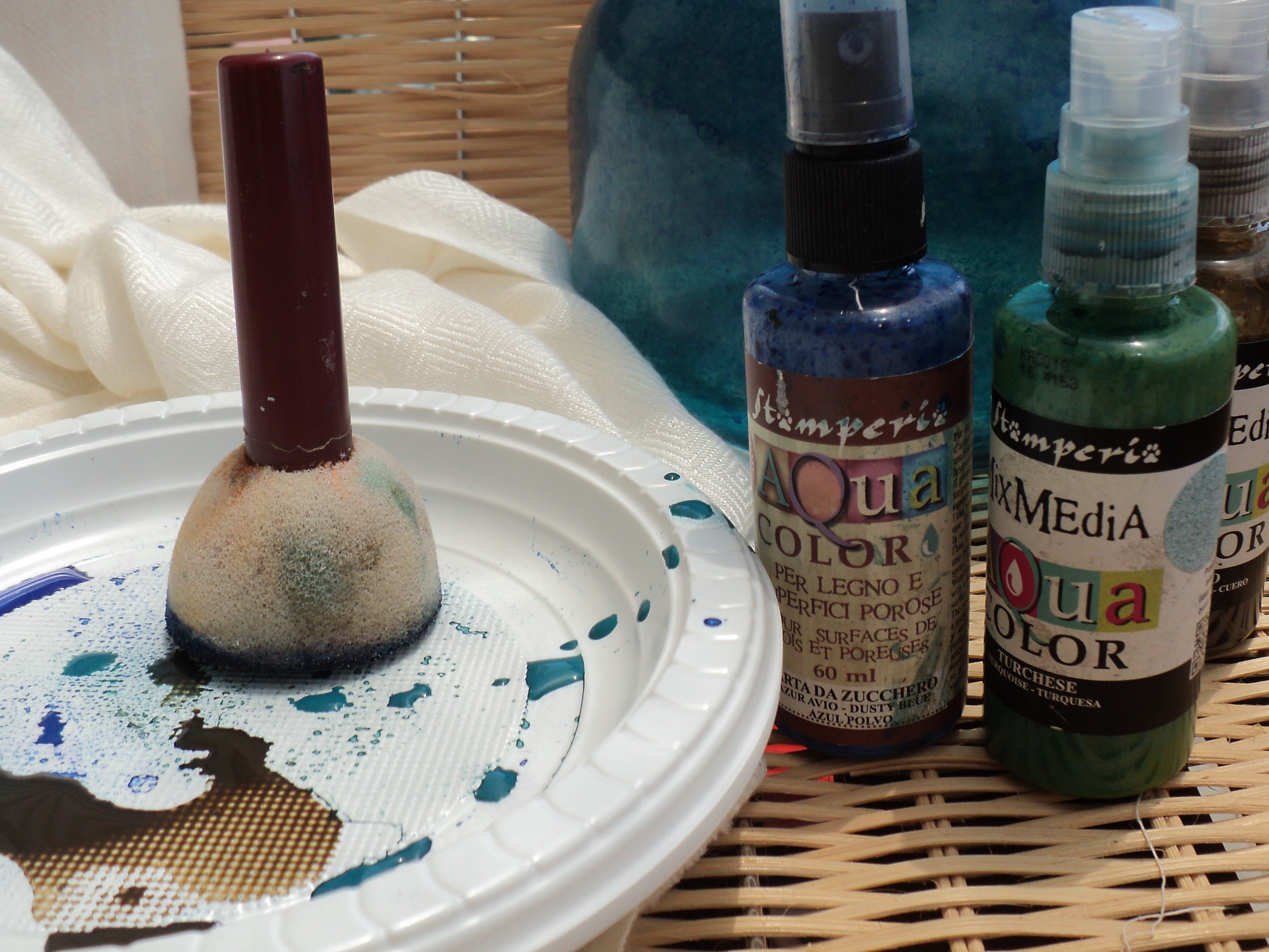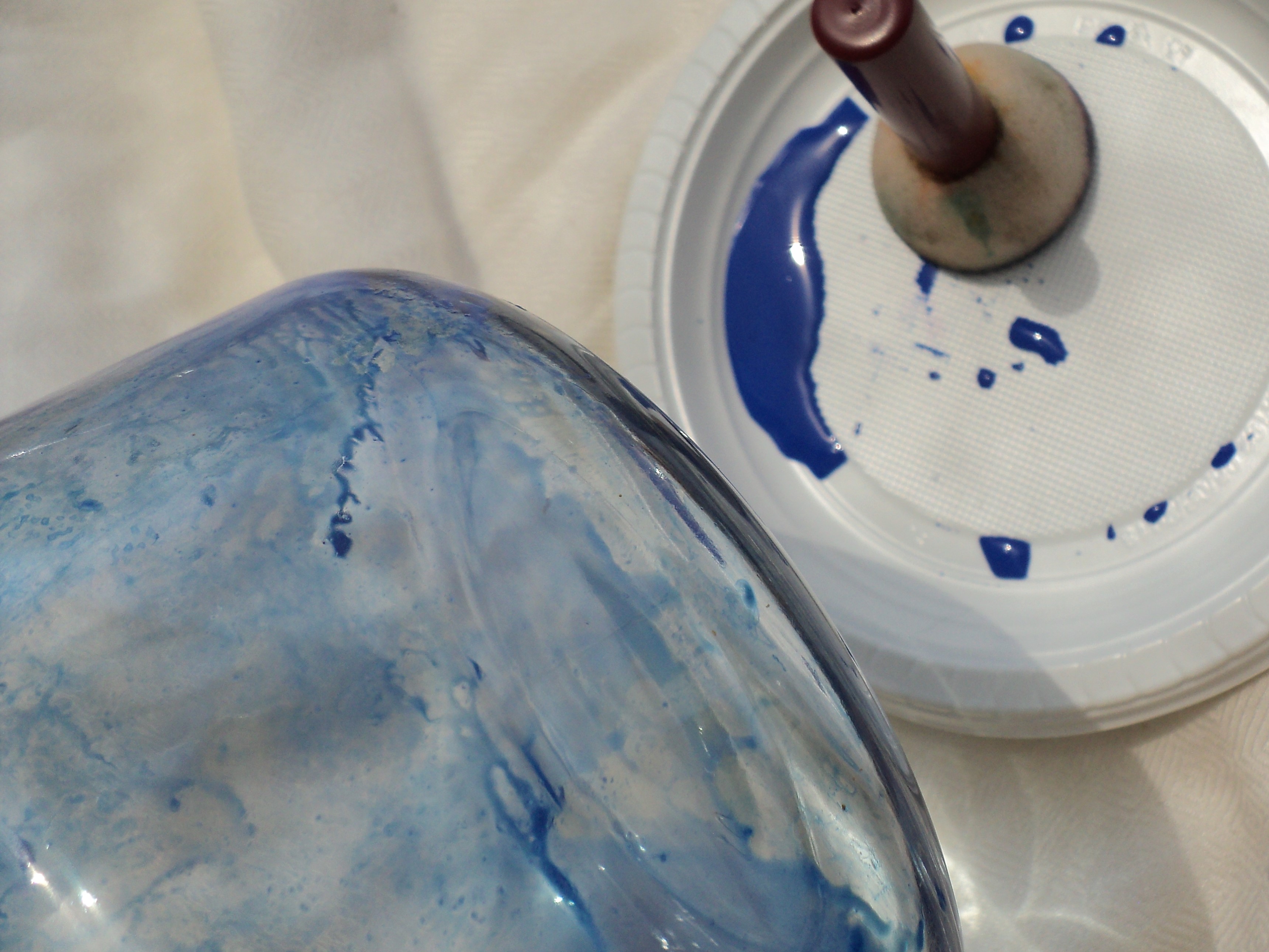 1 – Βάζουμε μικρή ποσότητα από το Light Blue Aqua Color σε ένα πλαστικό πιατάκι και αρχίζουμε να το εφαρμόζουμε ταμποναριστά με το σταμπαδόρο πάνω στη γυάλινη επιφάνεια.