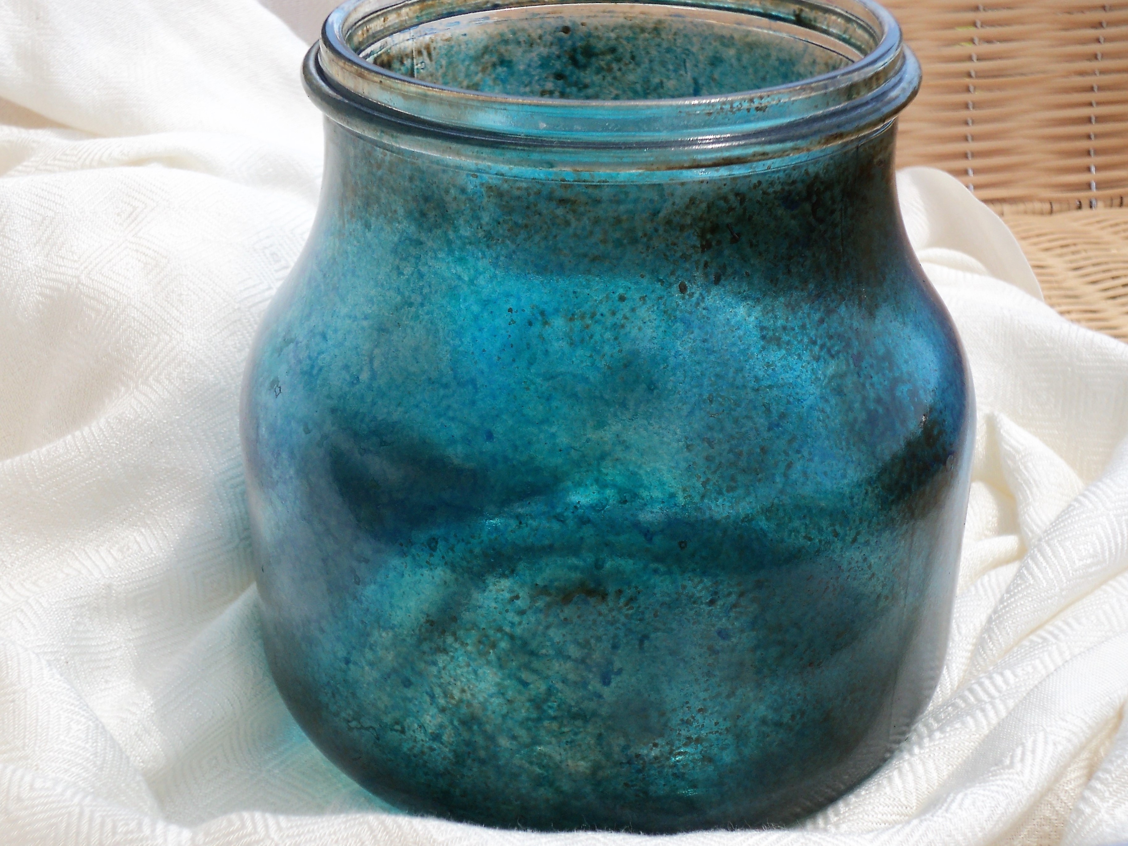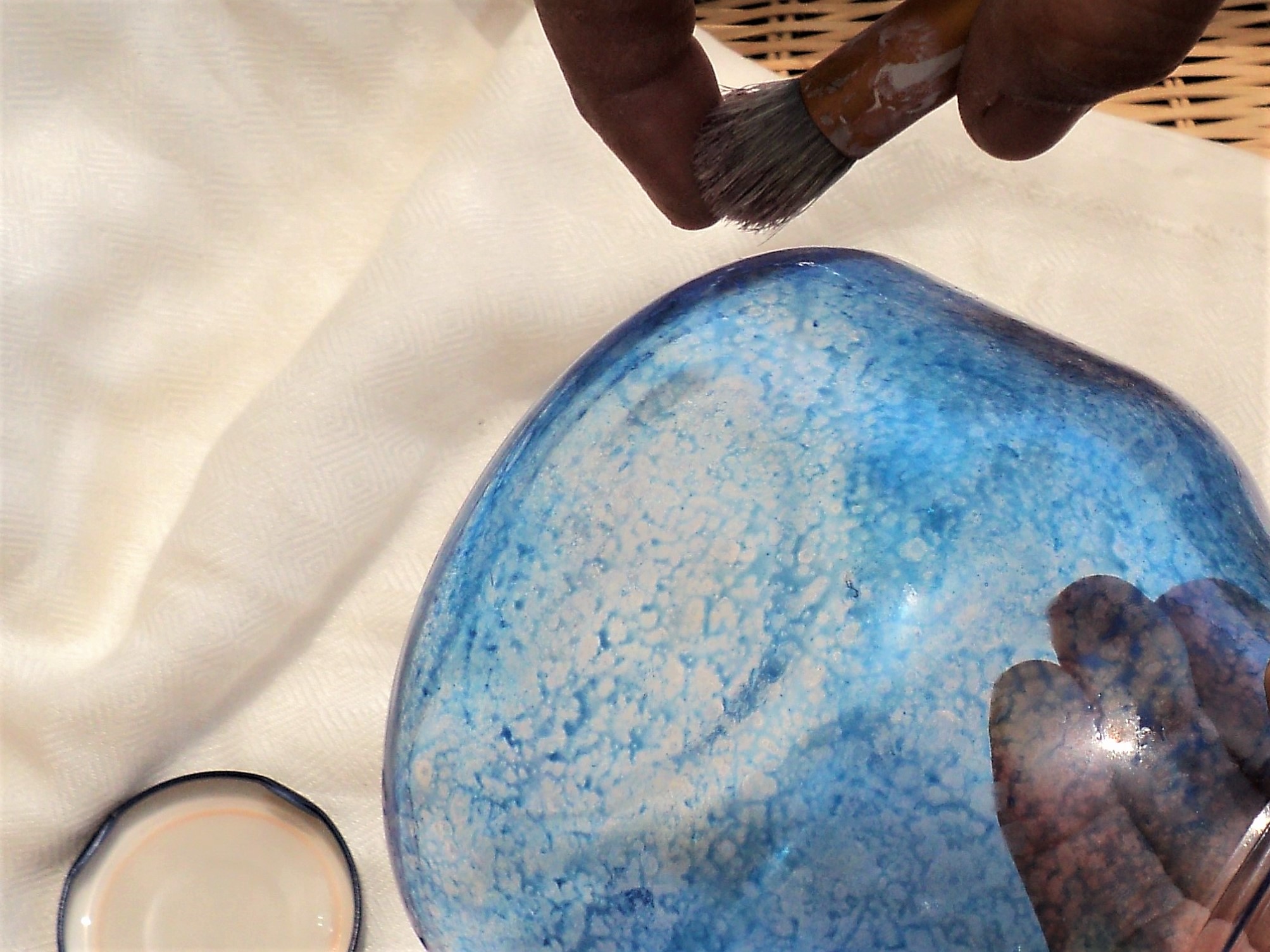6 – Ρίχνουμε λίγο από το διάφανο σμάλτο νερού σε λευκό χρώμα στο εσωτερικό του κηροπήγιου, το περιστρέφουμε ώστε να καλύψουμε όλη την επιφάνειά του και το αφήνουμε να στεγνώσει. Με τον τρόπο αυτό αναδεικνύοται καλύτερα τα χρώματα στο εξωτερικό.