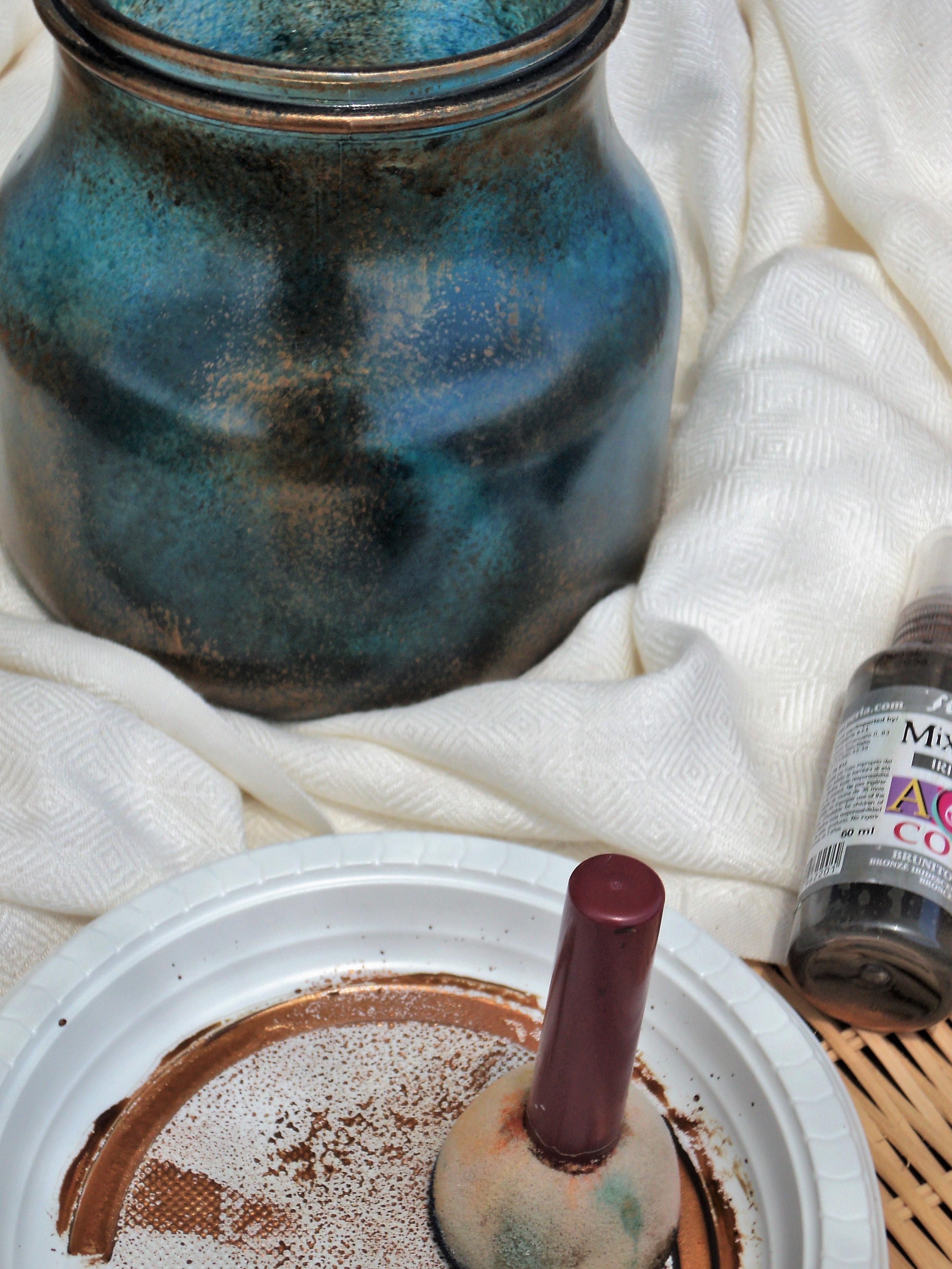 5 – Αφήνουμε να στεγνώσουν καλά τα χρώματα και στη συνέχεια εφαρμόζουμε με το πινέλο-σφουγγάρι το Aqua Color Iridescent Bronze. Εναλλακτικά μπορούμε να επιλέξουμε to ασημένιο ή χρυσό χρώμα.