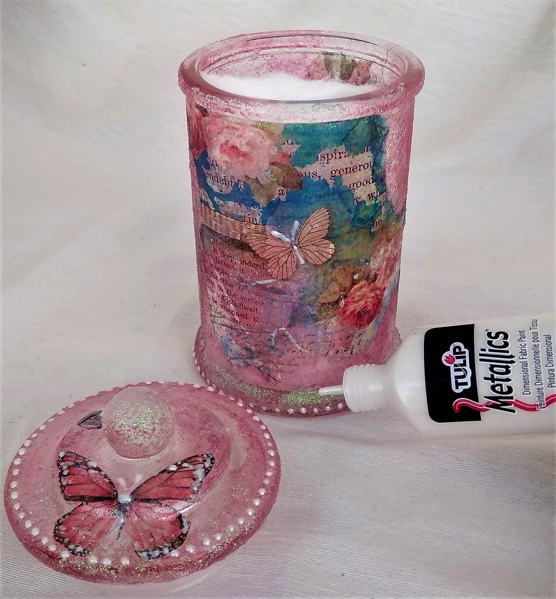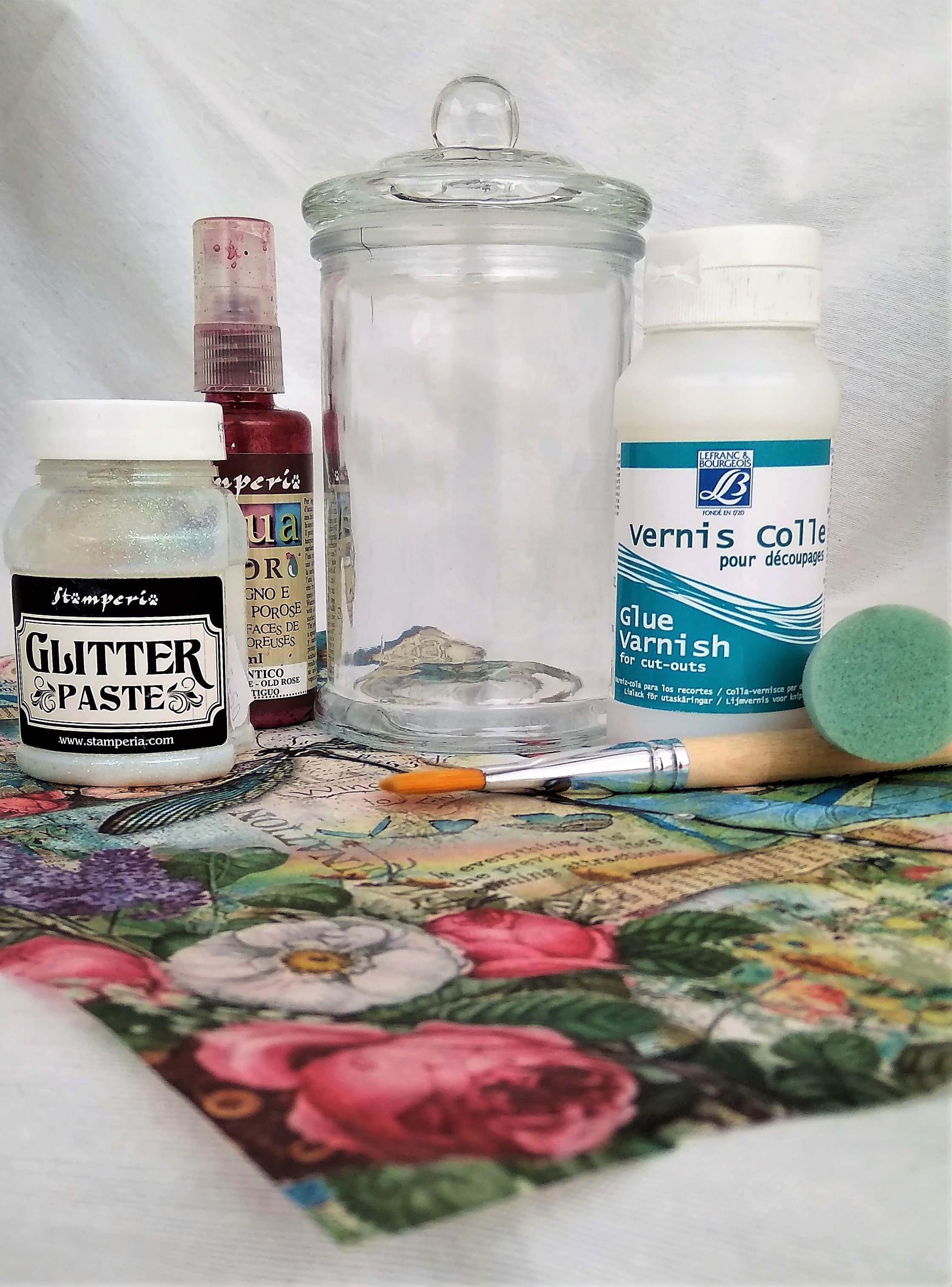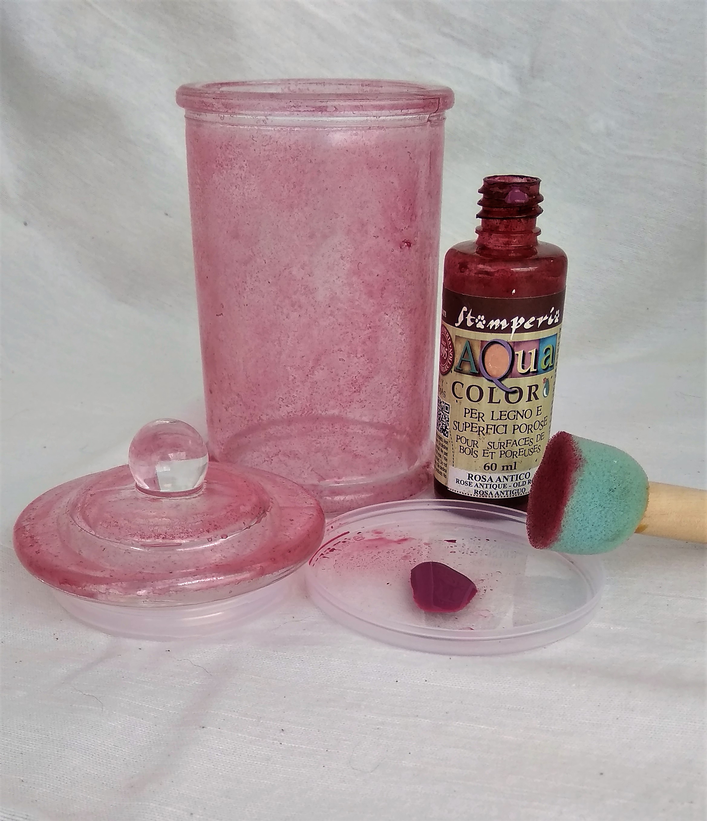1 – Βάζουμε μικρή ποσότητα από το Aqua color σε ένα πλαστικό πιατάκι και εφαρμόζουμε ταμποναριστά το χρώμα με με το πινέλο – σφουγγάρι στο βαζάκι και στο καπάκι.