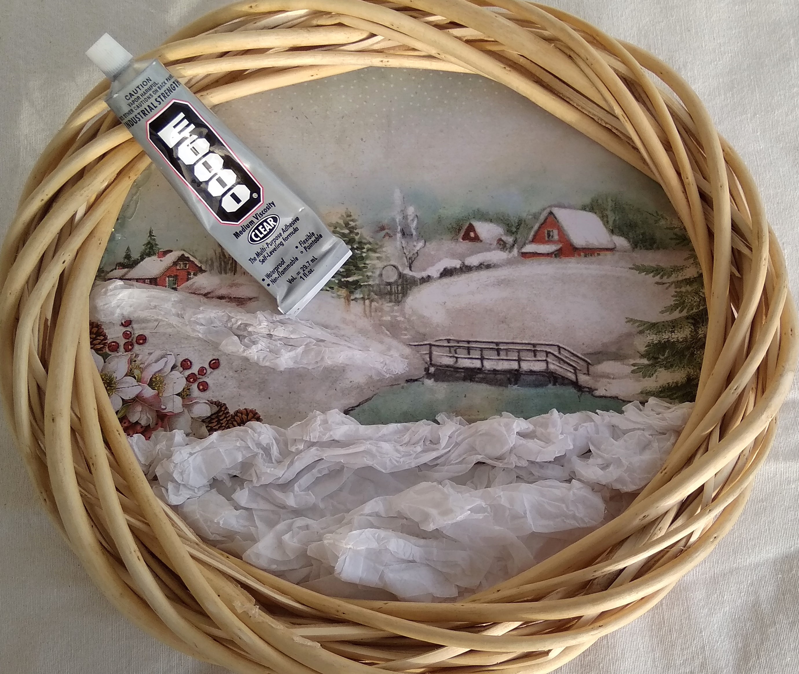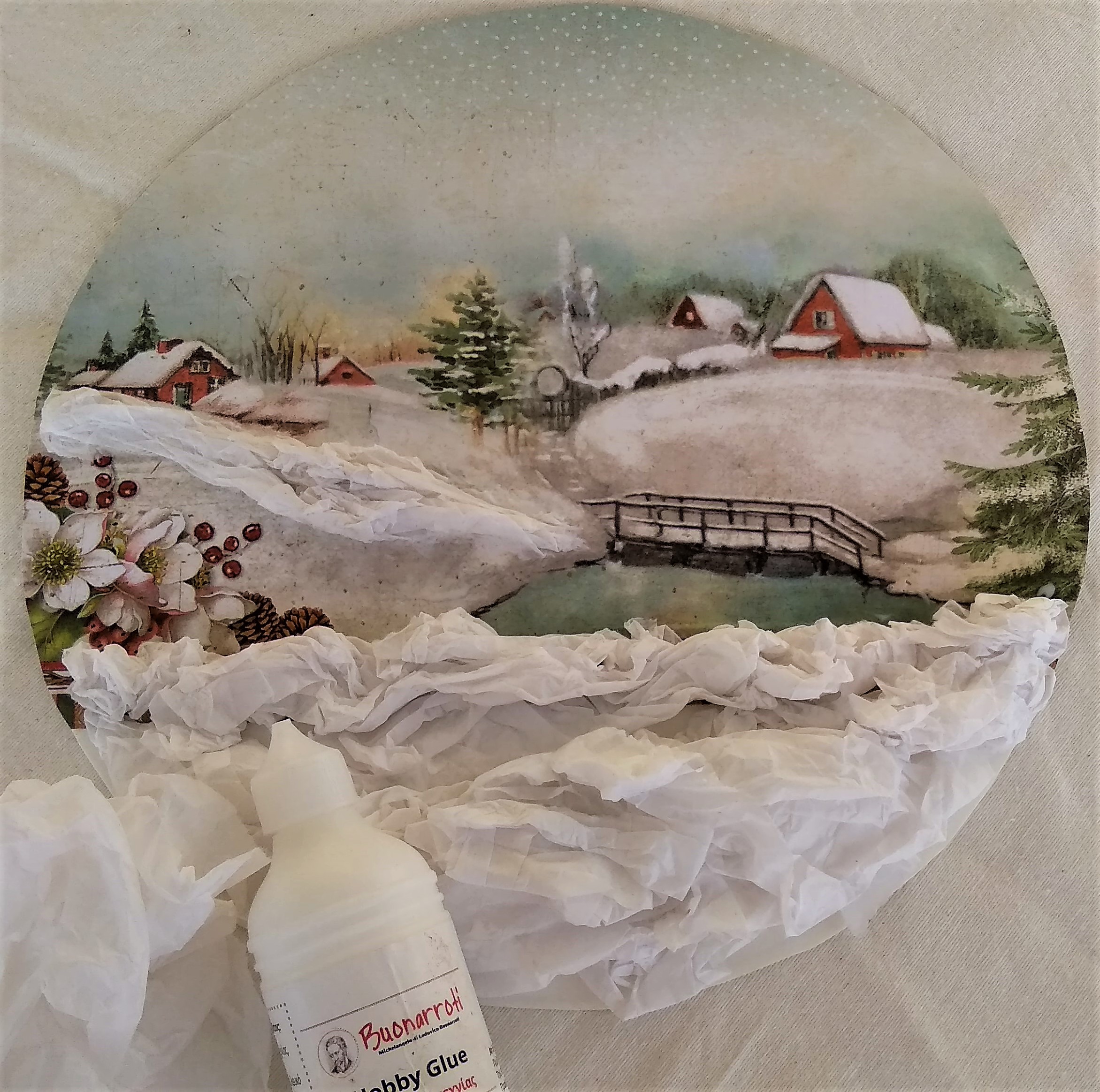 2 – Κολλάμε το χαρτί του srapbooking με το χιονισμένο τοπίο πάνω στο stone paper με την κόλλα Hobby Glue, φροντίζοντας να αφήσουμε ένα κενό περίπου 7εκ. στο κάτω μέρος.