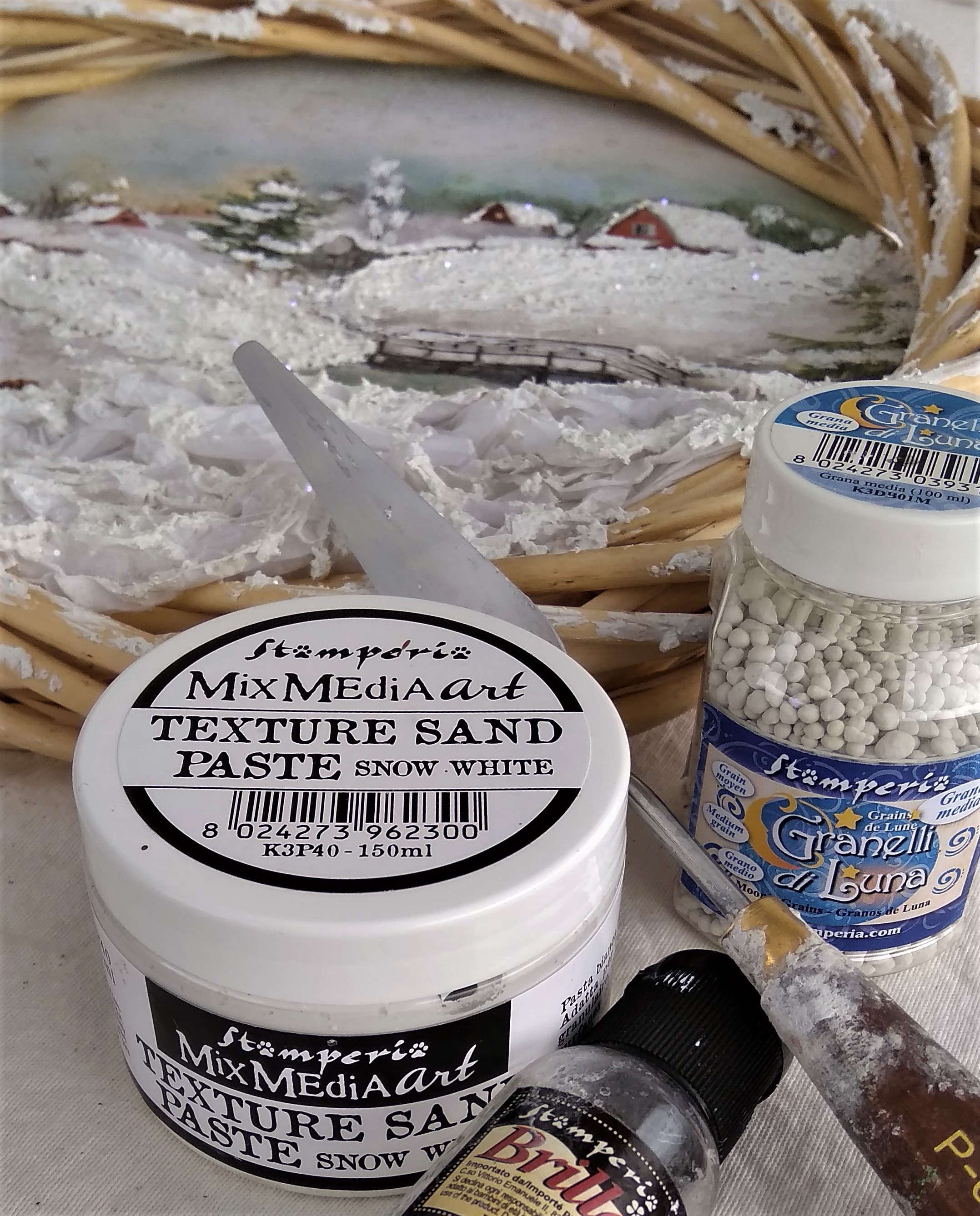 5 – Με τη βοήθεια της σπάτουλας εφαρμόζουμε πάνω στο χαρτί αφής καθώς και στα βουνά, στις σκεπές των σπιτιών και στα δένδρα την πάστα απομίμησης χιονιού, δίνοντας αποτέλεσμα ανάγλυφου, χιονισμένου τοπίου. Όσο είναι νωπή η πάστα, ρίχνουμε από πάνω τους κόκκους Granelli di Luna και το glitter ώστε να ενσωματωθούν με την απομίμηση χιονιού.