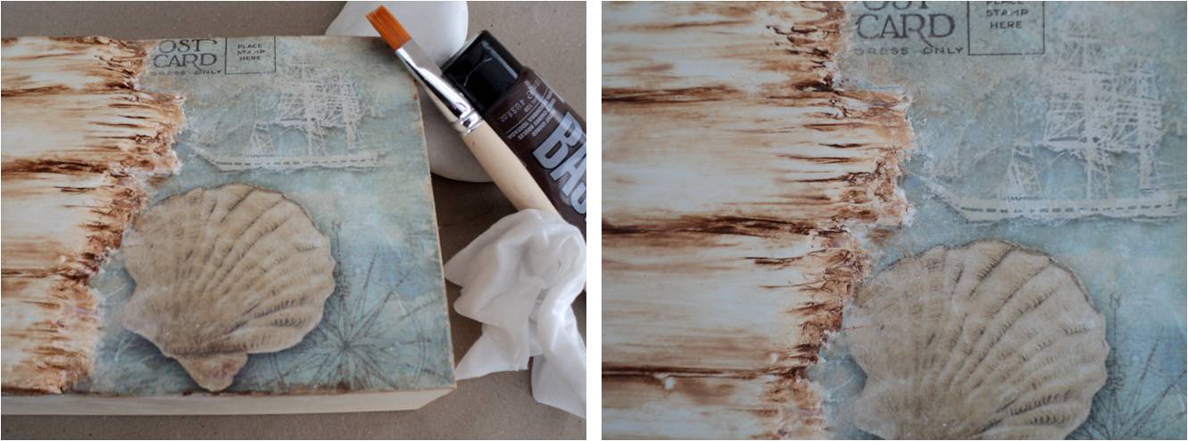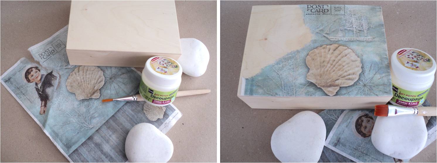 1 – Κόβουμε το ριζόχαρτο και το κολλάμε με την κόλλα decoupage στο πάνω μέρος του κουτιού.