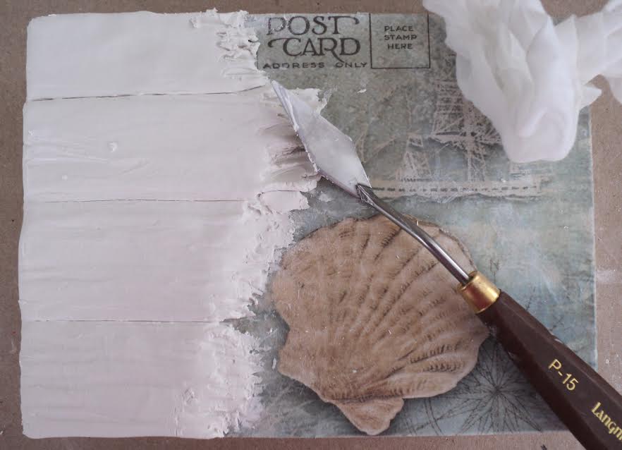 3 – Εφαρμόζουμε μία στρώση κόλλας Hobby Glue στο 1/3 περίπου του κουτιού και τοποθετούμε μία-μία τις λωρίδες πηλού. Με τη βοήθεια της πιο φαρδιάς σπάτουλας, πιέζουμε και απλώνουμε τον πηλό, δίνοντας στο τελείωμα του, όψη φθαρμένου ξύλου.