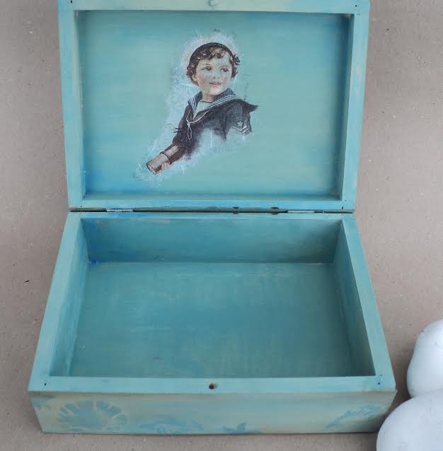 5 – Βάφουμε το υπόλοιπο κουτί εξωτερικά και εσωτερικά, συνδυάζοντας τα δύο χρώματα κιμωλίας. Μόλις στεγνώσουν τα χρώματα, κολλάμε στο εσωτερικό του πάνω μέρους του κουτιού κάποιο από τα μοτίβα του ριζόχαρτου με κόλλα decoupage.