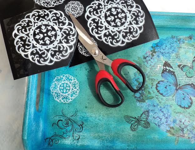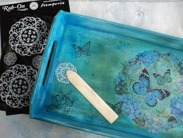 6. Επιλέγουμε σχέδια από το φύλλο με τα Rub On Deco Transfer Doilies της Stamperia. Ξεκολλάμε προσεχτικά το σχέδιο που θέλουμε από το μαύρο φύλλο μαζί με τη διάφανη μεμβράνη. Το τοποθετούμε στο σημείο που θέλουμε και τρίβουμε από πάνω από τη μεμβράνη με την κοκάλινη γλυφίδα, ώστε να “μεταφερθεί” η εικόνα. Στη συνέχεια αφαιρούμε τη μεμβράνη και επαναλαμβάνουμε τη διαδικασία για όσα σχέδια θέλουμε.
