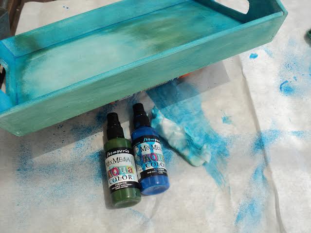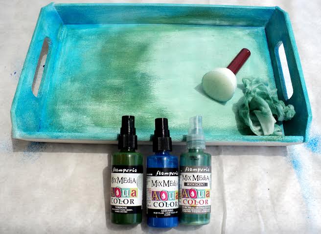 2. Αφήνουμε να στεγνώσει καλά το Gesso και ψεκάζουμε το δίσκο με τα χρώματα Aqua Color. Στη συνέχεια ταμπονάρουμε με το πινέλο-σφουγγάρι ή περνάμε το δίσκο με ένα μωρομάντηλο για να αναμείξουμε τα χρώματα. Αποφεύγουμε να ψεκάσουμε το δίσκο στο σημείο που θα κολλήσουμε το ριζόχαρτο. Εάν πάει χρώμα σε εκείνο το σημείο, μπορούμε να το καθαρίσουμε τρίβοντας το δίσκο με ένα μωρομάντηλο.