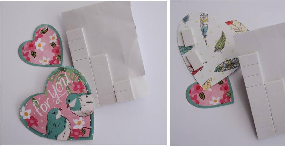 3 – Κόβουμε την καρδιά από το χαρτί για scrapbooking, κολλάμε στην πίσω πλευρά της τα αυτοκόλλητα σφουγγαράκια για 3D αποτέλεσμα και την τοποθετούμε πάνω στην επιφάνεια.