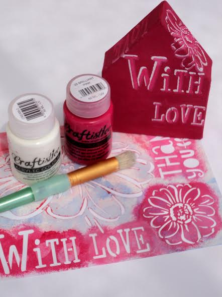 2 – Αφού στεγνώσει το χρώμα, εφαρμόζουμε στην επιφάνεια το Stencil και με τη βοήθεια του ειδικού πινέλου, αποτυπώνουμε τα σχέδια μας, ταμπονάροντας το λευκό ακρυλικό χρώμα. Από πάνω μπορούμε να εφαρμόσουμε και το Brilliant Pink.