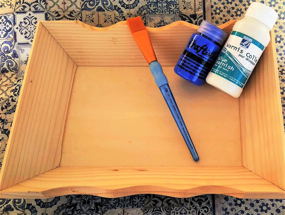 Κόβουμε λωρίδες και τις κολλάμε στα πλαινά τοιχώματα του ξύλινου αντικειμένου - εάν θέλουμε μπορούμε να καλύψουμε και τη βάση του ή να τη βάψουμε με ακυλικό χρώμα.