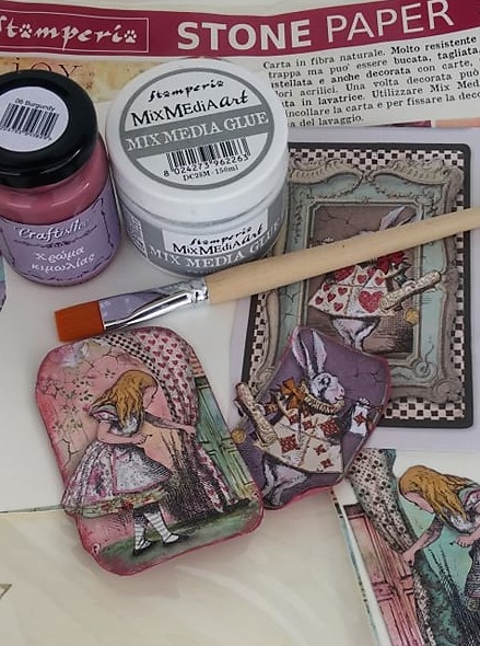 6 – Κόβουμε τα μοτίβα που θέλουμε από το ριζόχαρτο και το χαρτί scrapbooking και τα κολλάμε με την κόλλα Mix Media στο Stone Paper, εφαρμόζοντας μία στρώση κάτω από κάθε μοτίβο και μία στρώση από πάνω. Αφού στεγνώσει καλά η κόλλα, τα κόβουμε ακολουθώντας το περίγραμμά τους και βάφουμε την πίσω πλευρά τους με όποιο από τα χρώματα Aqua Color θέλουμε.