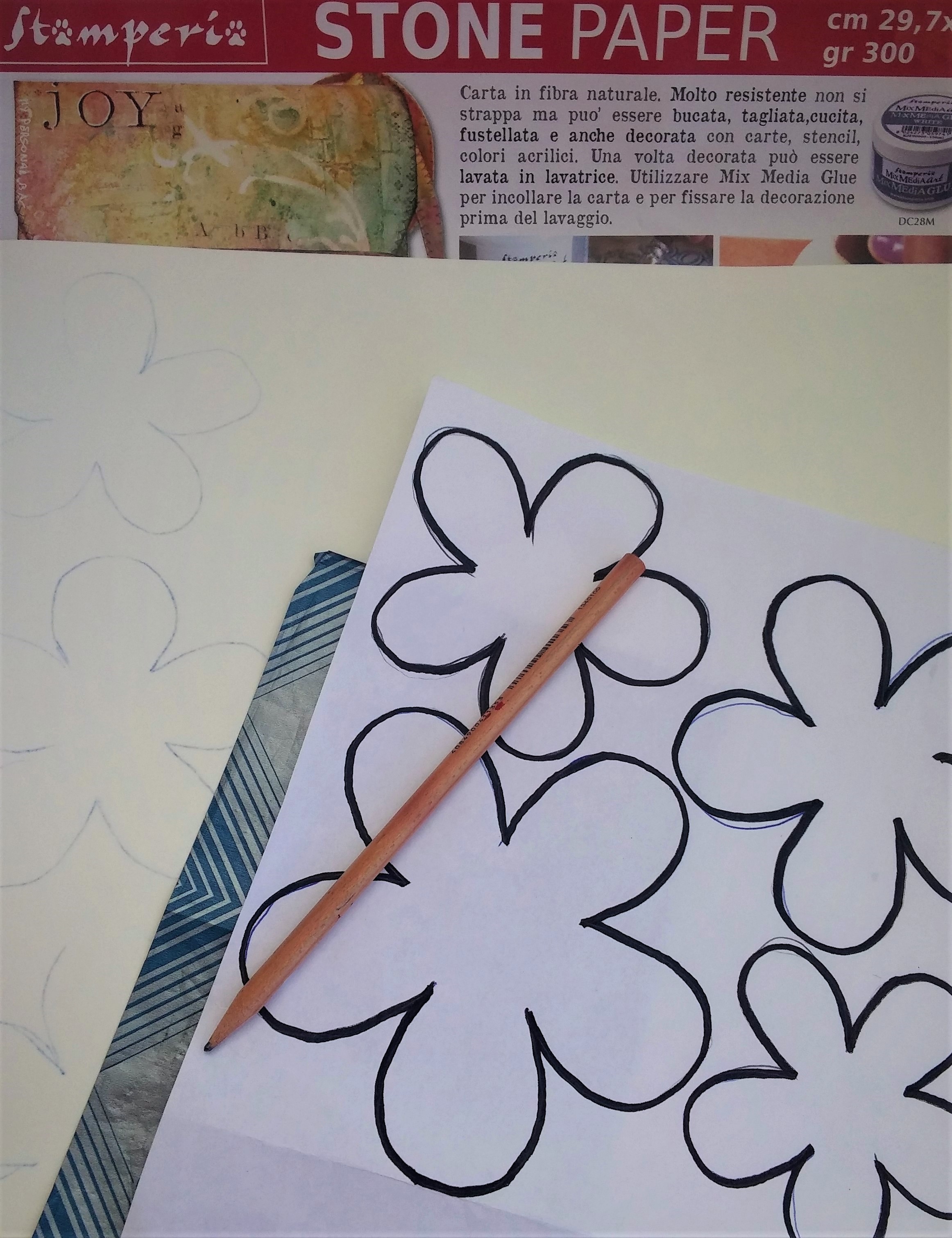 1 – Εκτυπώνουμε το πατρόν και αντιγράφουμε τα λουλούδια πάνω στο Stone Paper χρησιμοποιώντας το καρμπόν.