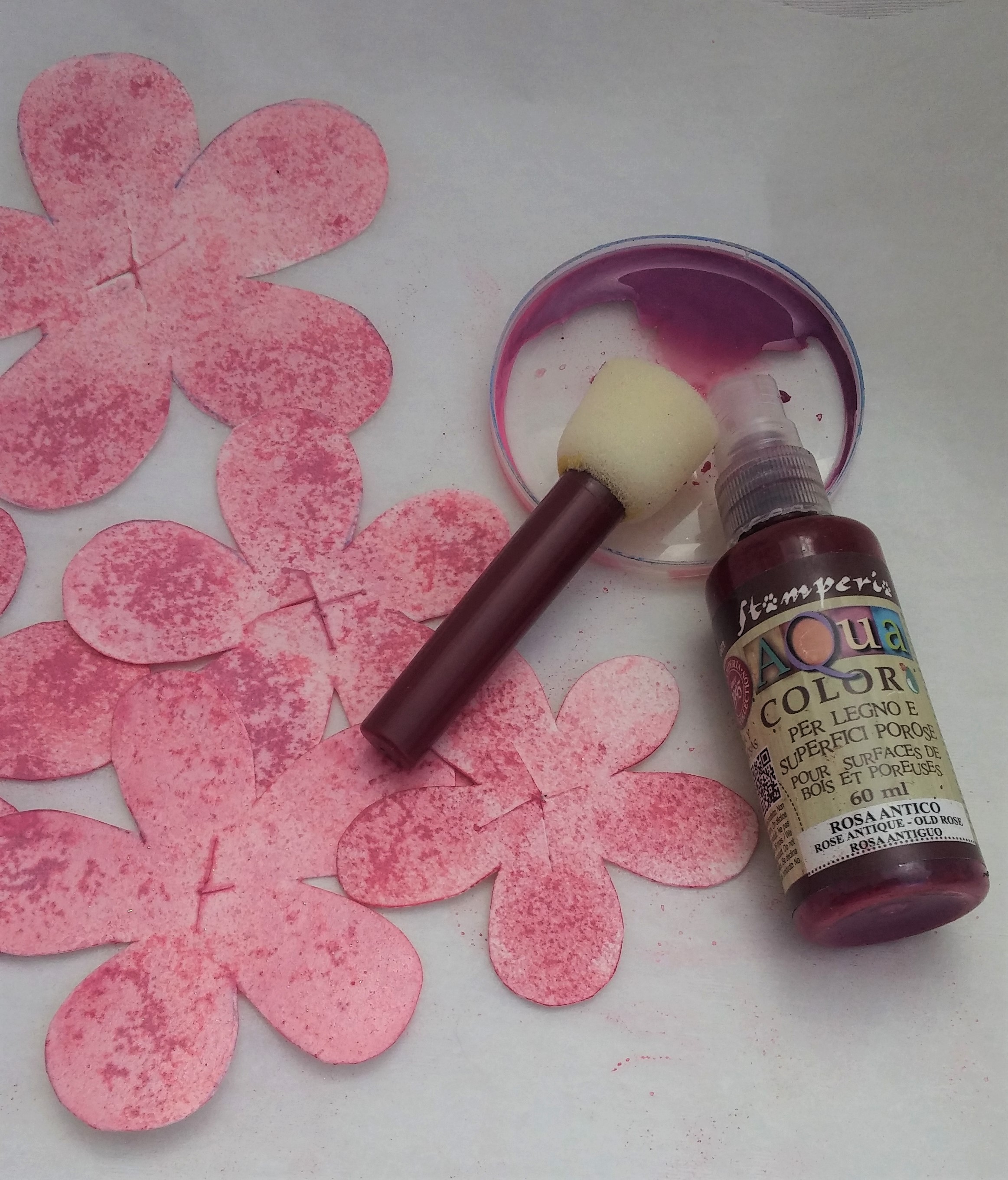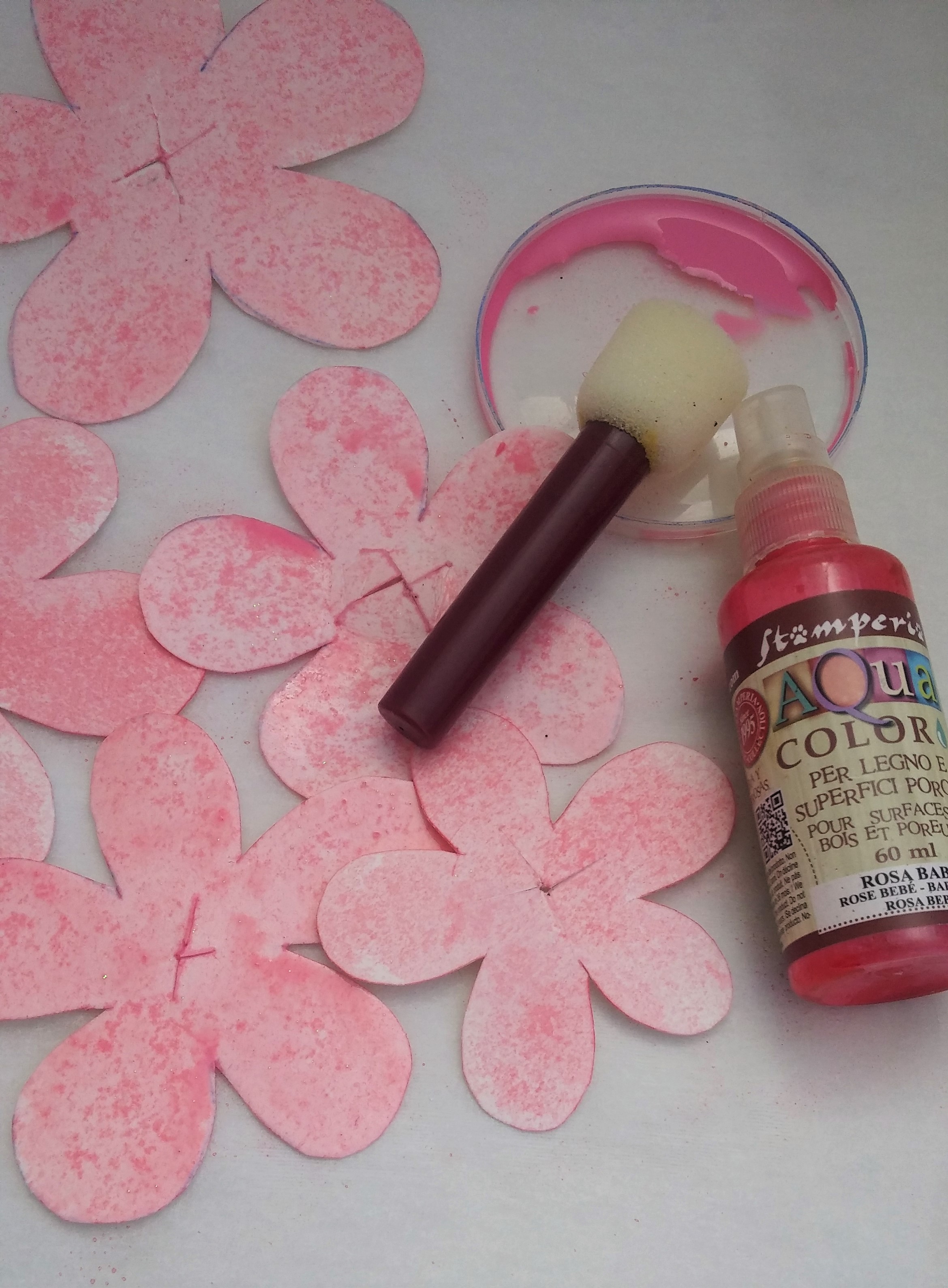 3 – Βάζουμε μικρή ποσότητα από το Aqua Color – Baby Pink σε ένα πλαστικό πιατάκι. Βάφουμε τα λουλούδια, εφαρμόζοντας ταμποναριστά το χρώμα με το πινέλο – σφουγγάρι. Αφού στεγνώσουν, επαναλαμβάνουμε τη διαδικασία με το Aqua Color – Rose Antique.