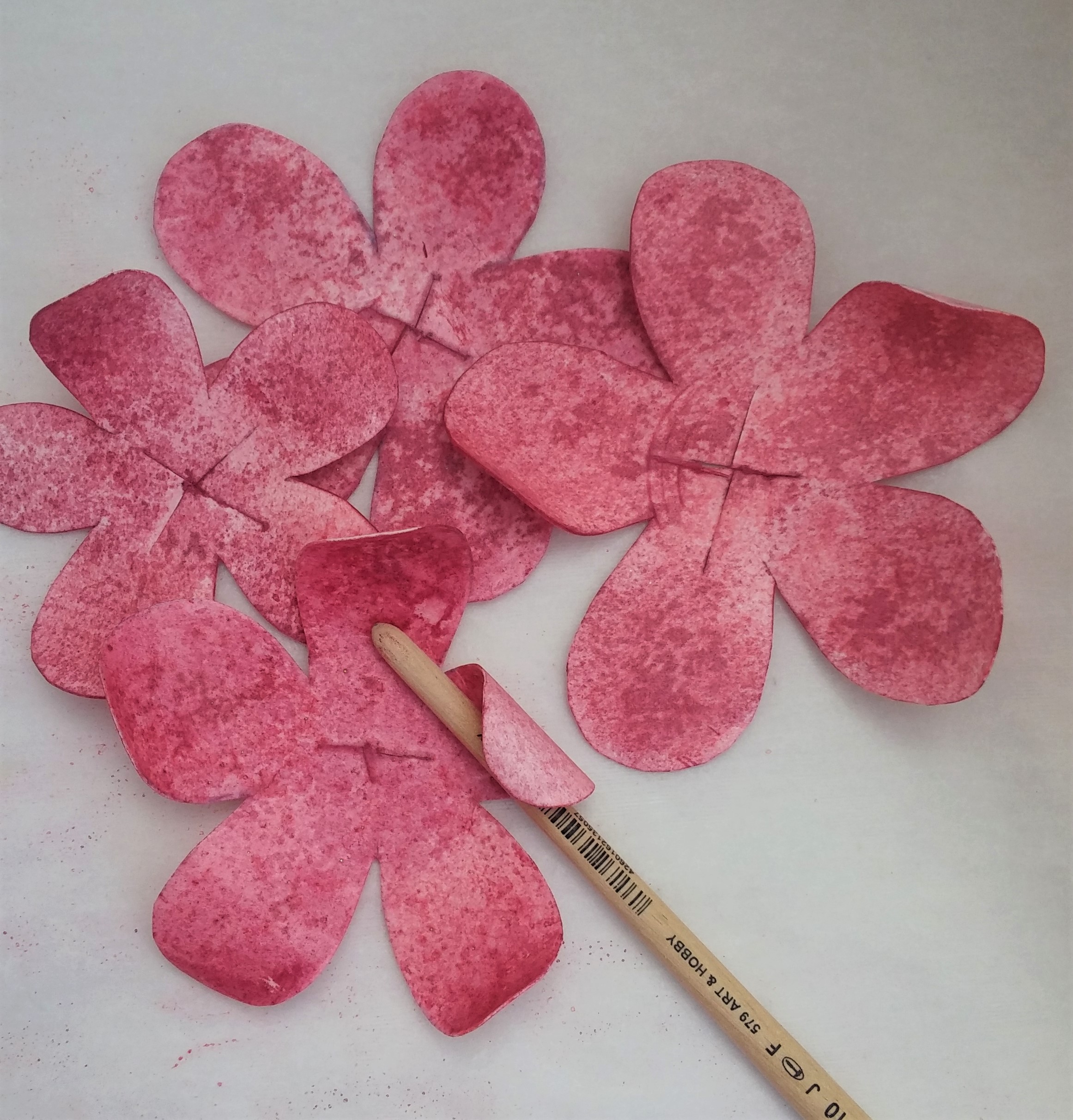 4 – Με τη βοήθεια ενός πινέλου και όσο είναι ακόμα νωπά από το χρώμα, τυλίγουμε ένα-ένα τα πέταλα γύρω από τη ξύλινη λαβή για να τους δώσουμε μια ελαφριά κλίση, ώστε να θυμίζουν αληθινά λουλούδια.