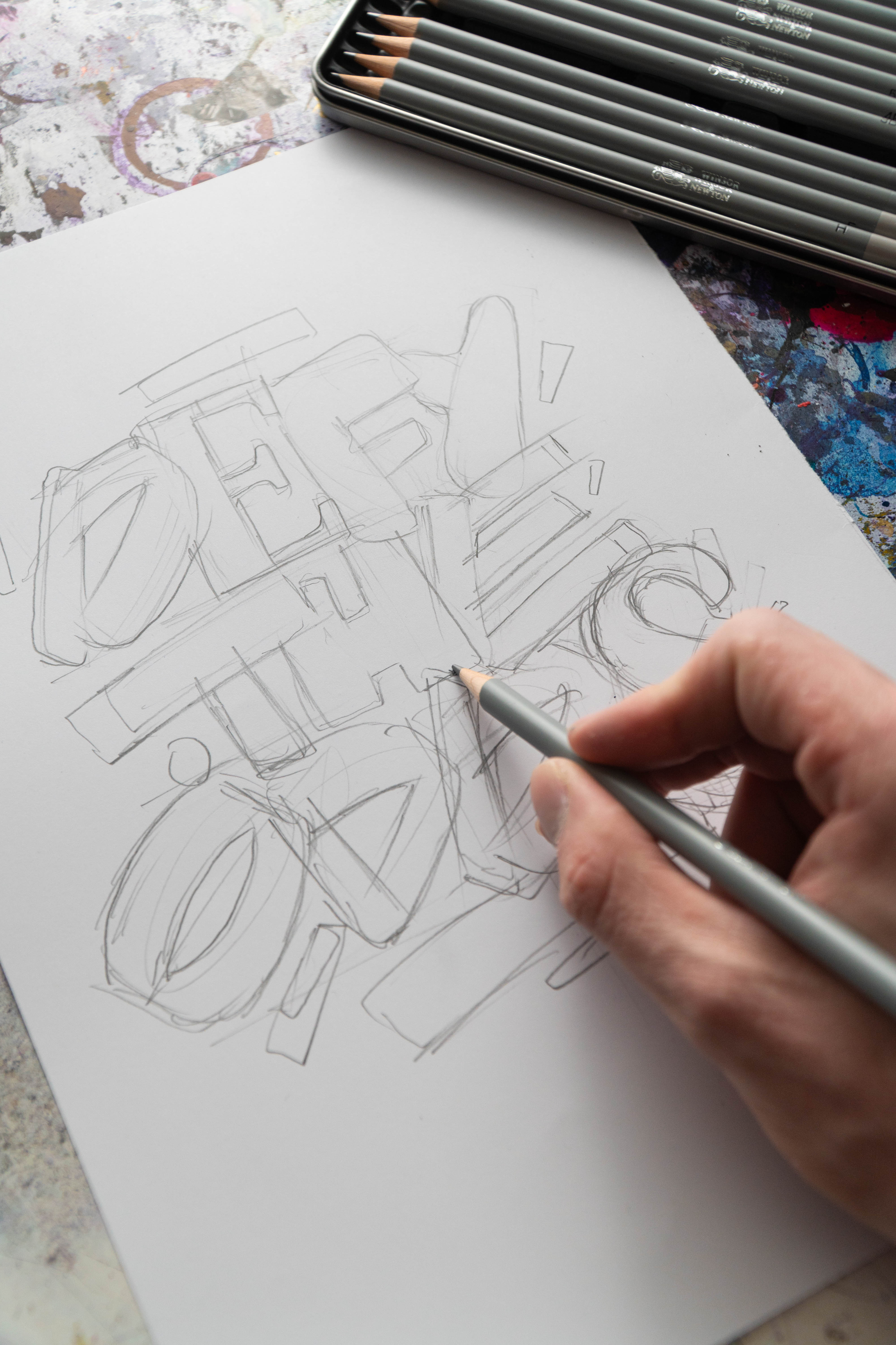 Βήμα 2: Τώρα που έχεις το περίγραμμα, ξεκίνα να σκιαγραφείς τα γράμματα. Μην ανησυχείς για την ακρίβεια σε αυτό το στάδιο – το σημαντικό είναι να κατανοήσεις τη γενική θέση και το σχήμα των γραμμάτων. Πειραματίσου με διαφορετικά στυλ γραμμάτων (π.χ., καλλιγραφικά, γεωμετρικά ή μοντέρνα στυλ). Όσο προχωράς, μπορείς να βελτιώνεις και να βελτιώνεις το σκίτσο σου μέχρι να σου αρέσει το αποτέλεσμα.