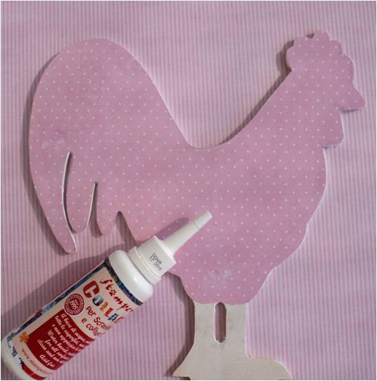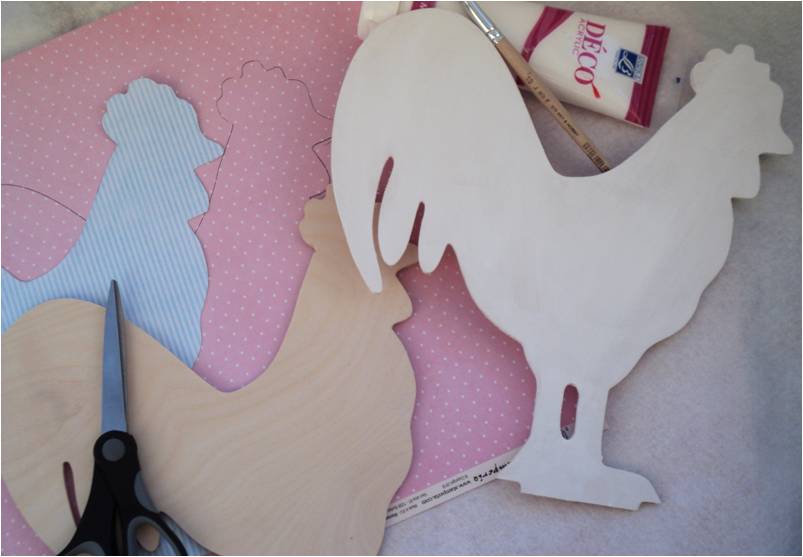 1 – Τοποθετούμε τον κόκορα πάνω στο χαρτί για scrapbooking και με το μολύβι σχεδιάζουμε το περίγραμμα του σώματός του. Επαναλαμβάνουμε τη διαδικασία με το άλλο χαρτί, ώστε να έχουμε δύο διαφορετικά σχέδια.