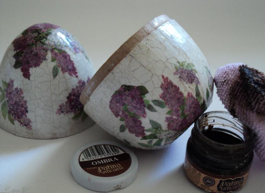 5 – Για να αναδείξουμε τα ραγίσματα του κρακελέ δύο συστατικών εφαρμόζουμε με ένα πανί την πατίνα.