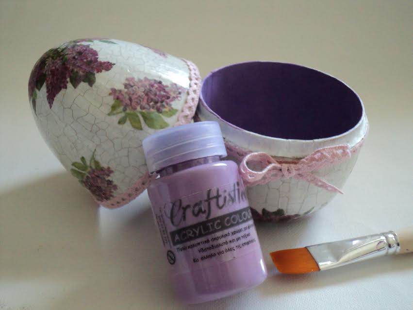 7 – Βάφουμε το εσωτερικό του αυγού ή όποιου άλλου χάρτινου αντικειμένου έχουμε χρησιμοποιήσει με το μοβ χρώμα και κολλάμε με δυνατή κόλλα την κορδέλα που έχουμε επιλέξει.