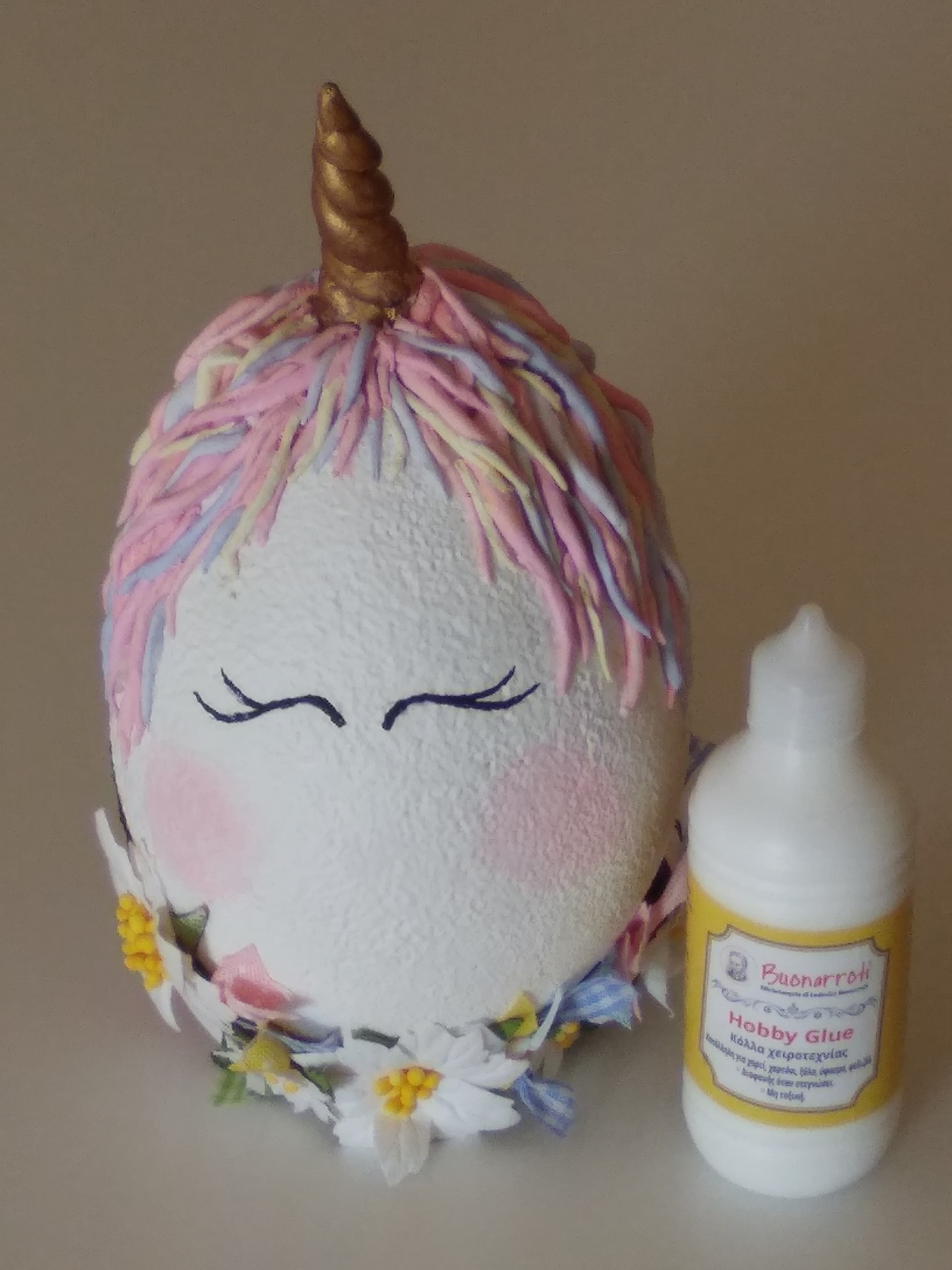 Φτιάχνουμε μακρόστενες λωρίδες (μακαρονάκια) και τα κολλάμε στο πάνω μέρος του αυγού με την hobby glue, δημιουργώντας έτσι τη χαίτη του μονόκερου.