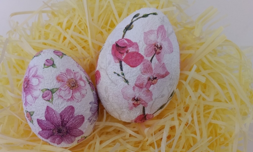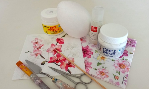 Επιλέξτε χαρτοπετσέτα με λευκό φόντο για εύκολη εφαρμογή και κολλήστε τα σχέδια πάνω στο αυγό χρησιμοποιώντας την κόλλα-βερνίκι για χαρτοπετσέτα Art Potch.