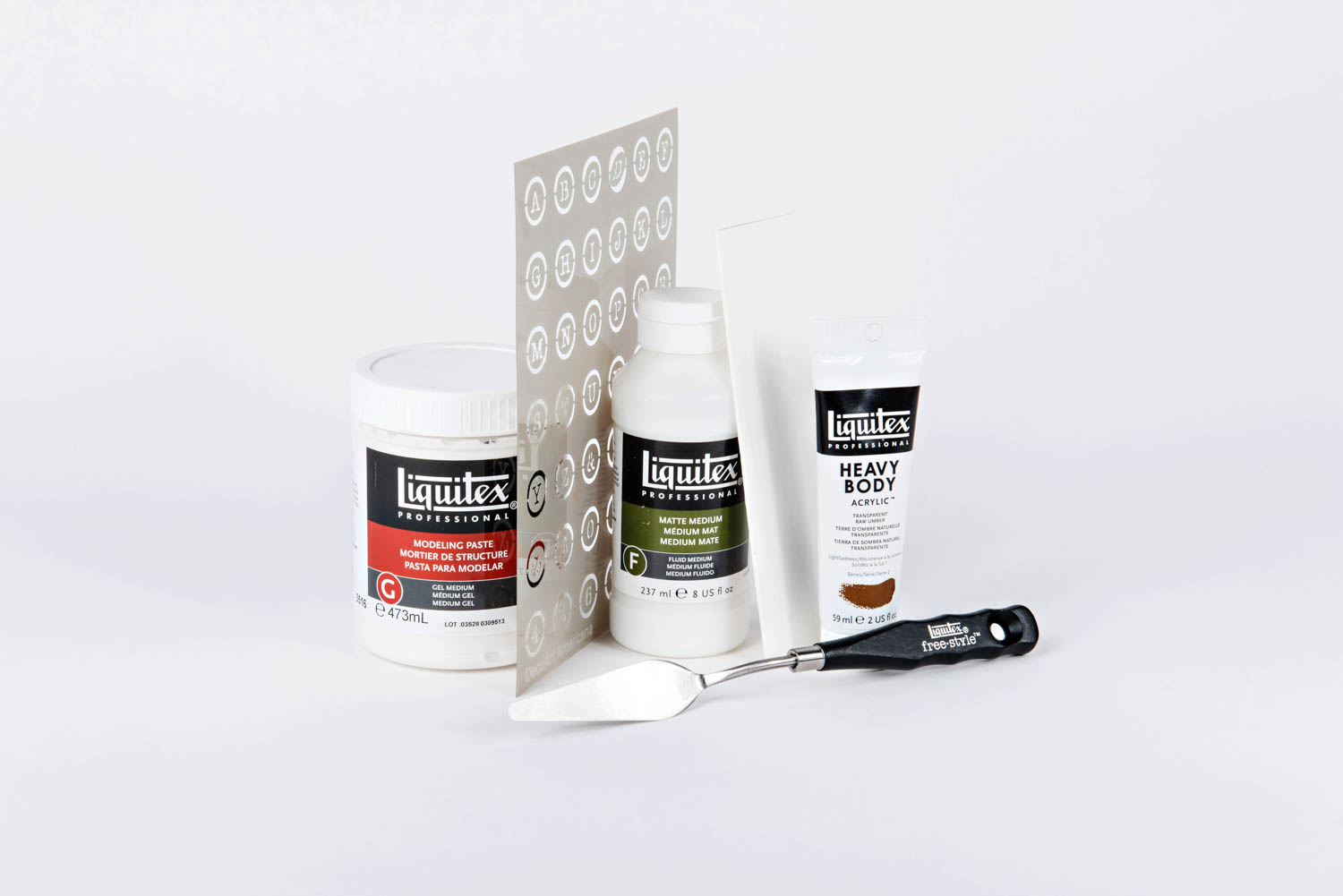 ΣΗΜΕΙΩΣΗ: Η πάστα διαμόρφωσης Liquitex Modeling Paste μπορεί να χρησιμοποιηθεί τώρα για να αποτυπώσουμε ανάγλυφα με το stencil, τα αρχικά ή το όνομα του συγγραφέα. Στο έργο που φτιάξαμε, η πάστα διαμόρφωσης έχει αναμειχθεί με το ακρυλκό Liquitex Heavy Body Acrylic, Yellow Oxide.
