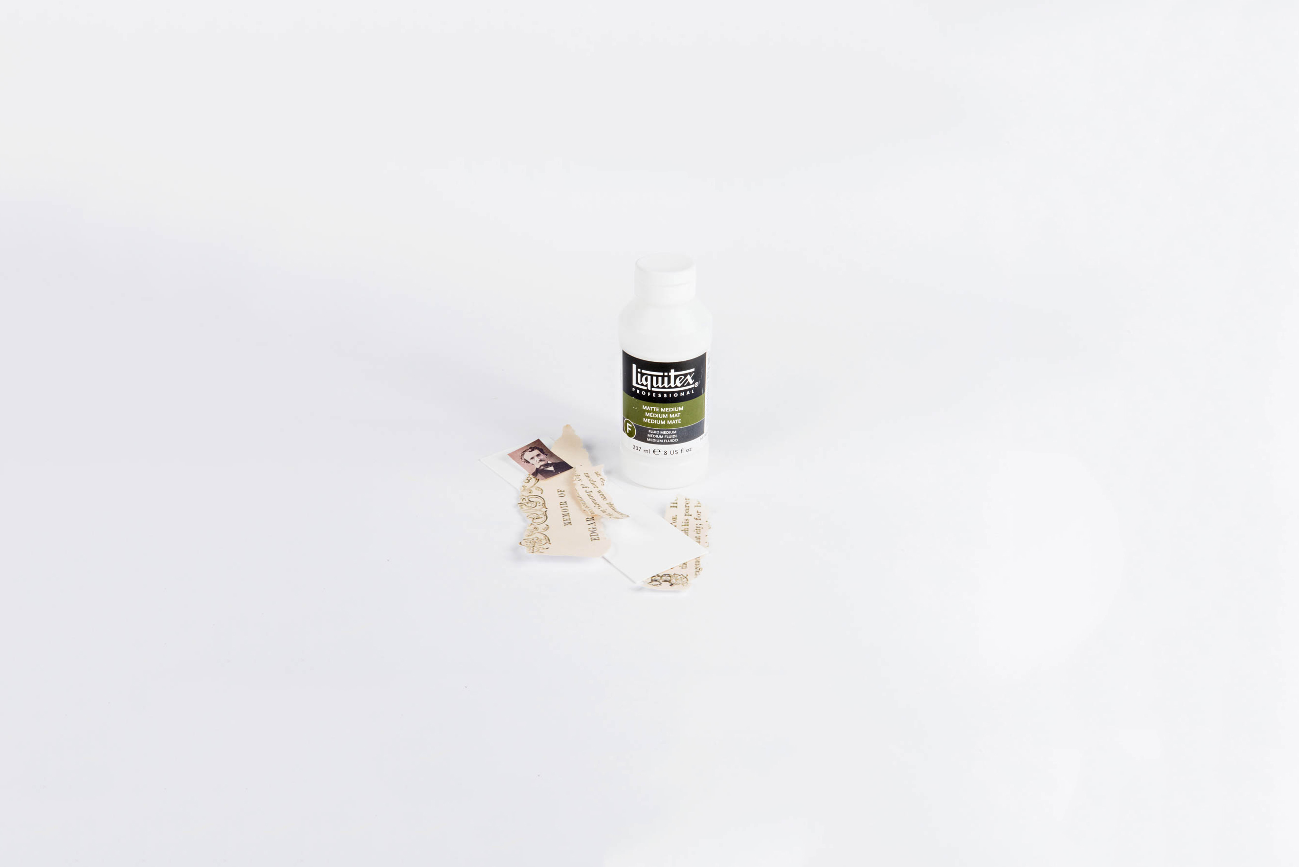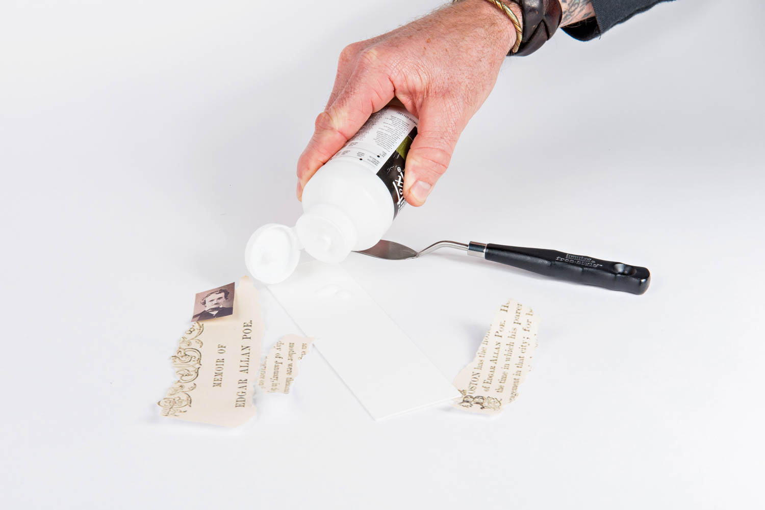 - Μόλις αποφασίσουμε πώς τα θέλουμε, τα κολλάμε πάνω στο σελιδοδείκτη με το Liquitex Matte Medium. Εάν θέλουμε μπορούμε να το αναμείξουμε πρώτα με χρώμα που προσδίδει διαφορετική λάμψη, ενισχύει και να αλλάζει την υφή του, αλλά είναι και εξαιρετική κόλλα για κολάζ. Εφαρμόζουμε μία λεπτή στρώση πίσω από κάθε εικόνα, τις τοποθετούμε και στη συνέχεια περνάμε άλλη μία στρώση από πάνω για να κολλήσουν.