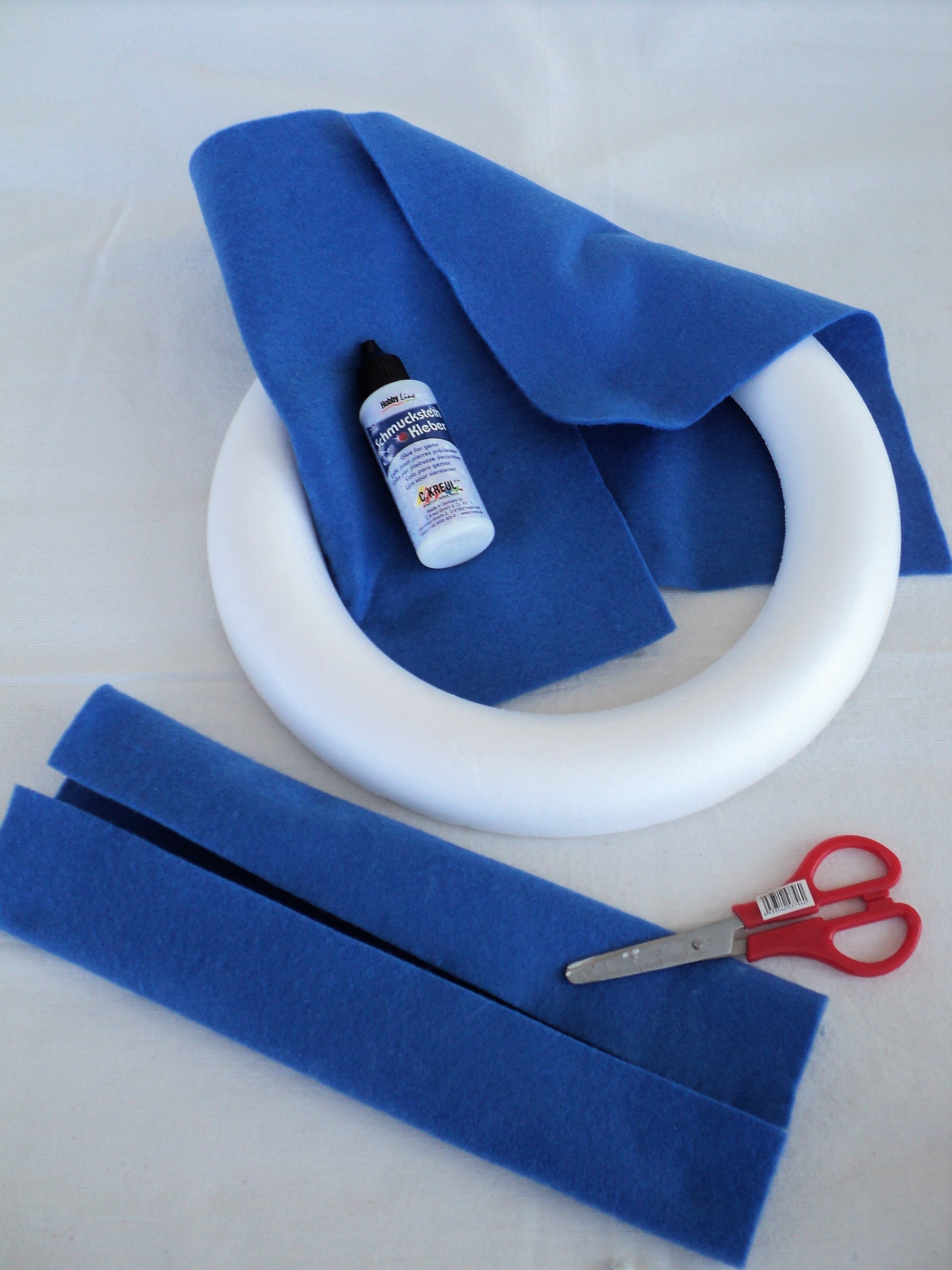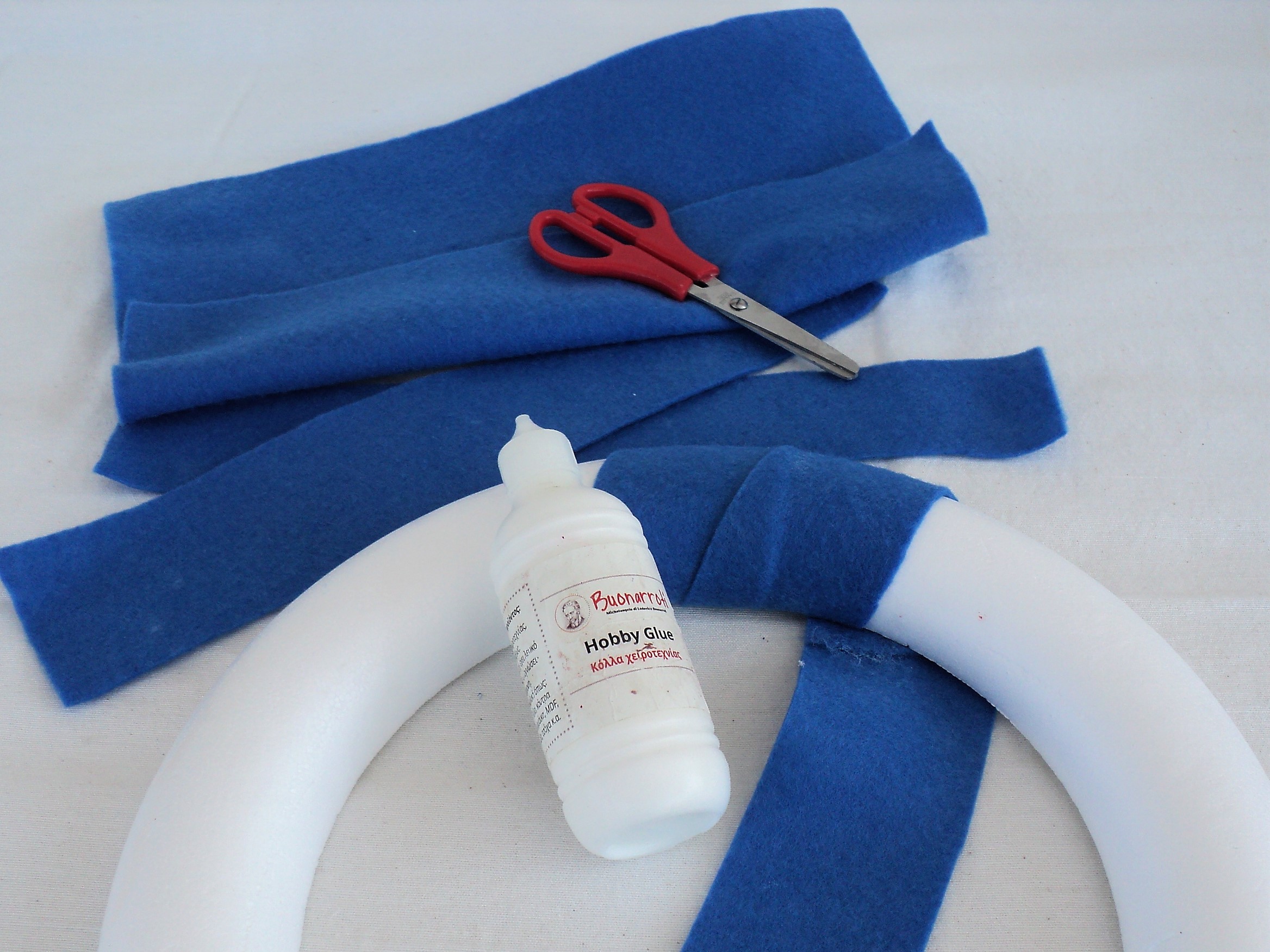 1 – Κόβουμε το κάθε κομμάτι μπλε τσόχας σε τέσσερις λωρίδες. Στη συνέχεια τις τυλίγουμε γύρω από το στεφάνι εφαρμόζοντας παράλληλα κόλλα Hobby Glue κάτω από τις ενώσεις για να σταθεροποιηθεί η τσόχα, μέχρι να καλύψουμε εντελώς το στεφάνι. Εναλλακτικά μπορούμε να χρησιμοποιήσουμε Κόλλα για Ύφασμα.