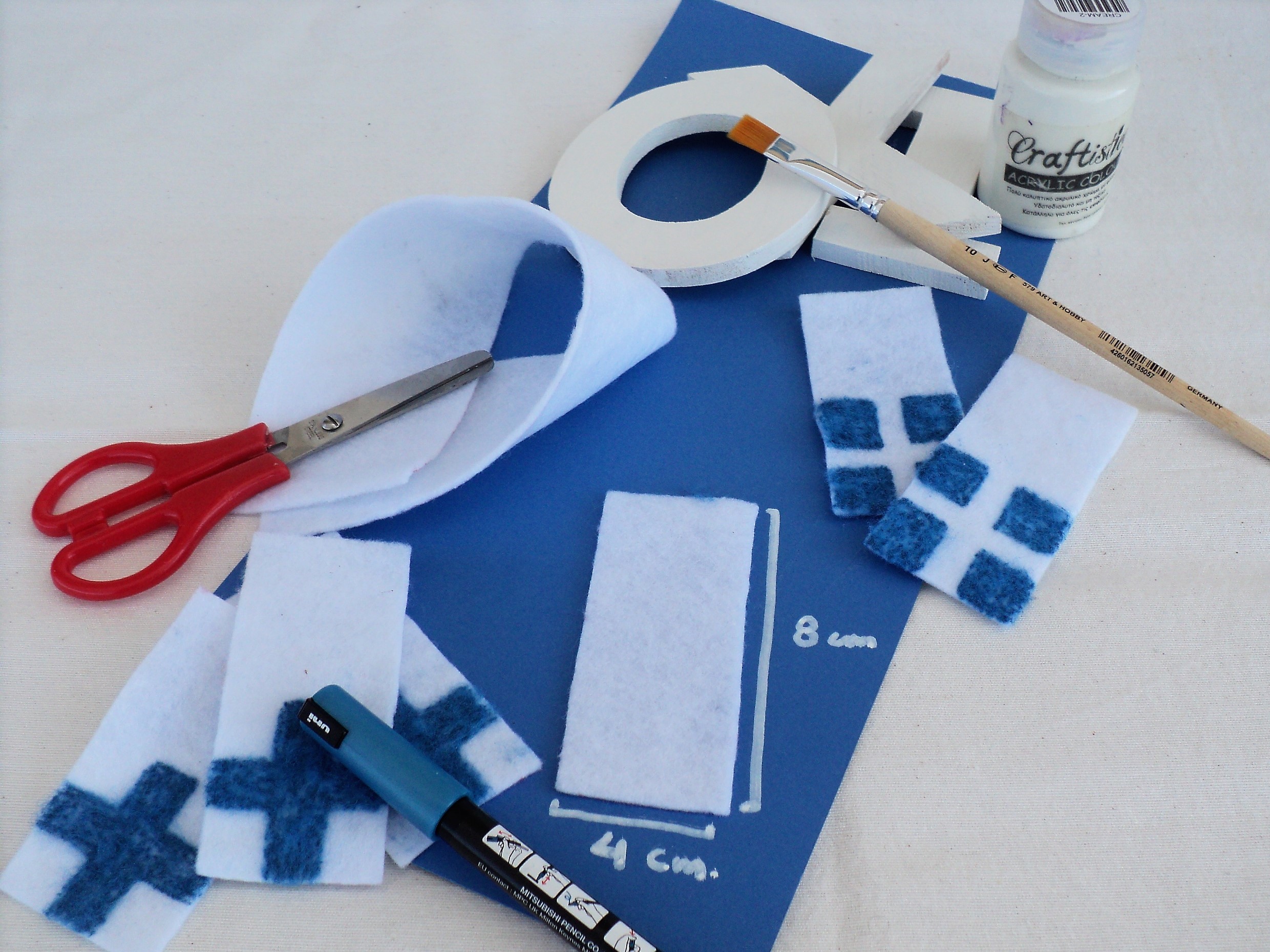 2 – Για να φτιάξουμε τα σημαιάκια, κόβουμε 4 κομματάκια από τη λευκή τσόχα, σε διάσταση 4*8εκ. Τα διπλώνουμε στη μέση ώστε να γίνουν τετράγωνα (4*4εκ.) και με το μαρκαδόρο ζωγραφίζουμε τον μπλε σταυρό. Αφού στεγνώσει καλά το χρώμα, τα διπλώνουμε στο λευκό κορδόνι και τα κολλάμε με Hobby Glue ή με κόλλα για ύφασμα.