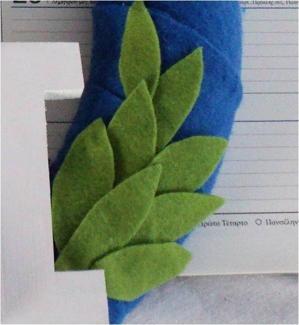 4 – Κόβουμε τα φυλλαράκια από την πράσινη τσόχα (θα χρειαστούμε περίπου 20). Μπορούμε αν θέλουμε να σχεδιάσουμε πρώτα το περίγραμμα τους με ένα μαρκαδοράκι.