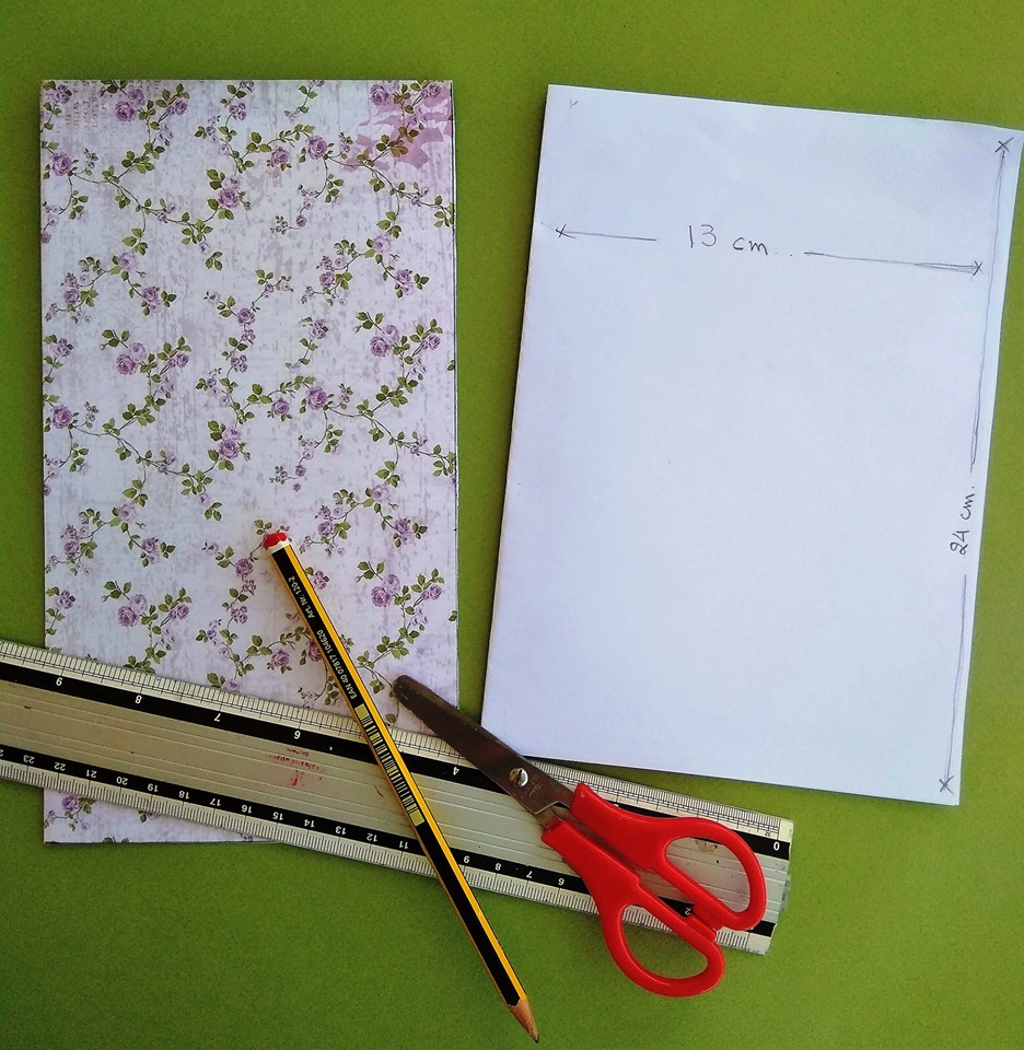 1 - Διπλώνουμε το χαρτί για scrabooking στην μέση και έπειτα το κόβουμε σε διαστάσεις 13εκ. το φάρδος και 24εκ. το ύψος.