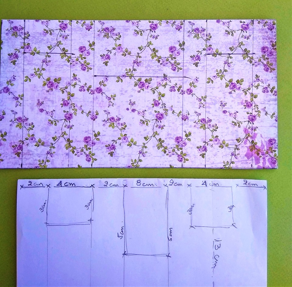 2 - Στην εσωτερική δηλ. αριστερή πλευρά της κάρτας, σημειώνουμε τις διαστάσεις που αναγράφονται στην φωτογραφία και αφού κόψουμε με το ψαλίδι την κάρτα στα σημεία αυτά, τα σπρώχνουμε προς τα μέσα και διπλώνουμε καλά.