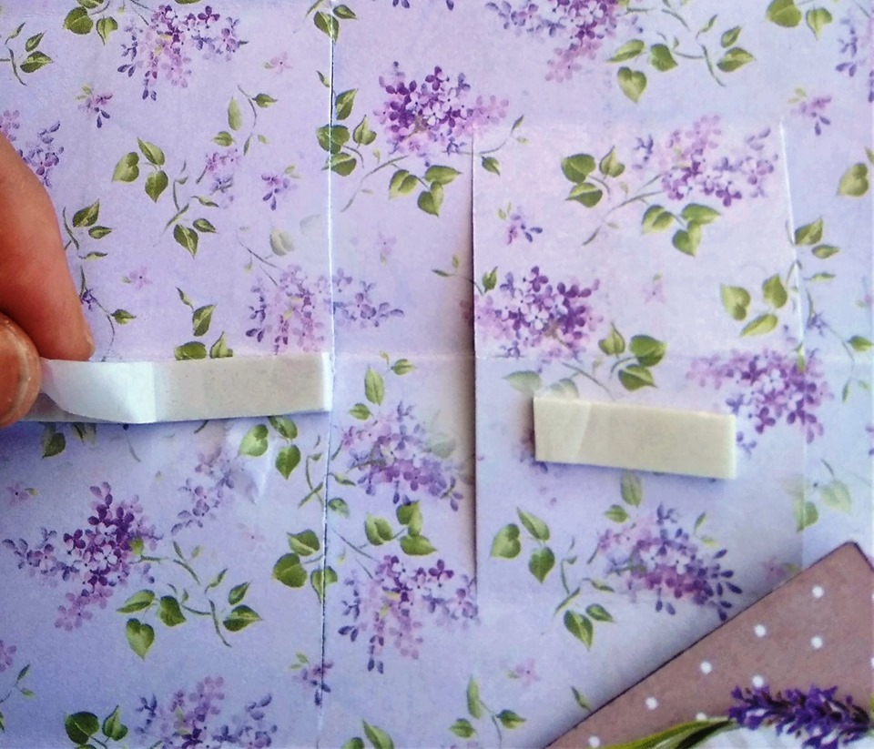 3 - Κόβουμε με το ψαλίδι, τα μοτίβα που θέλουμε από το δεύτερο χαρτί για scrabooking και τα κολλάμε στις εσωτερικές προεξοχές της κάρτας χρησιμοποιωντας την ταινία διπλής όψης.