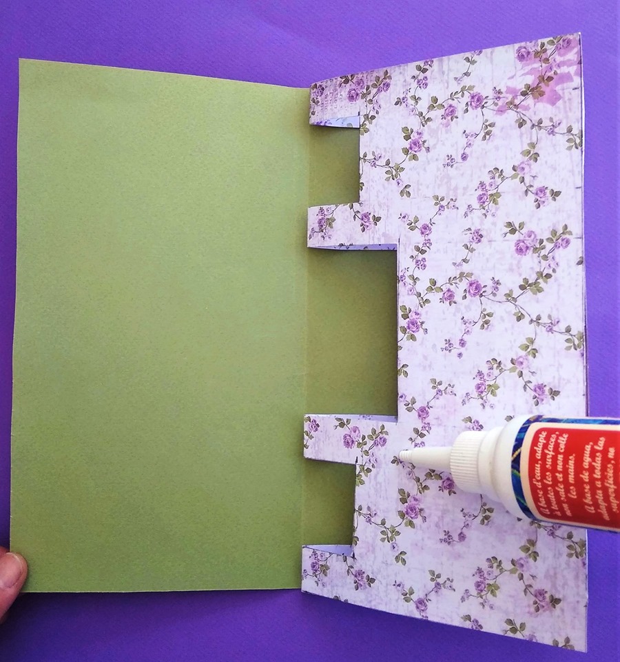 4 - Κόβουμε το πράσινο χαρτί, στις διαστάσεις της κάρτας (13εκ. x 24εκ.) και το κολλάμε στην εξωτερική της πλευρά.