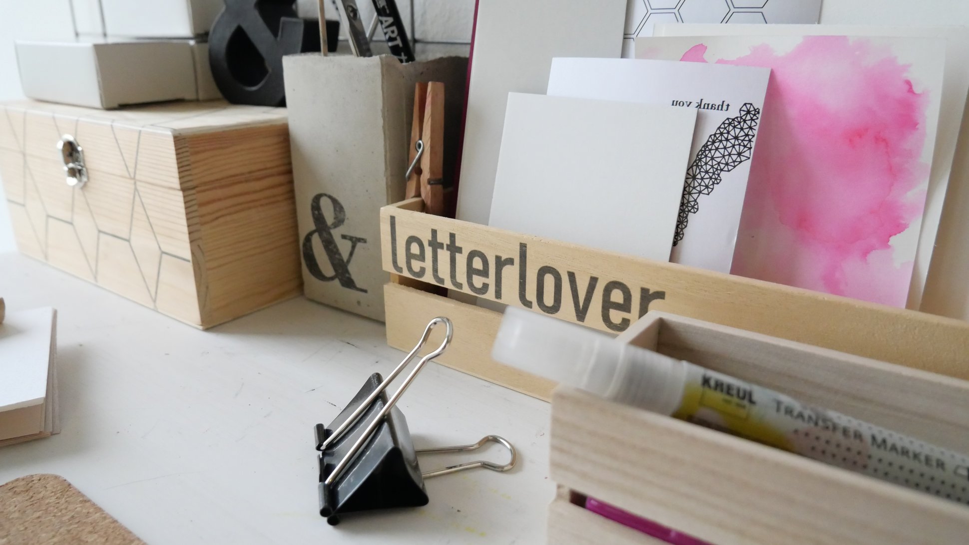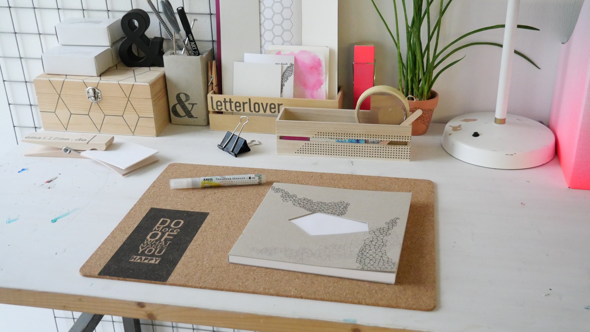 Θέλετε να δώσετε μία δημιουργική πινελιά στα γκρίζα αρχειοθετημένα έγγραφά σας και μία οργανωτική ματιά στα στυλό, τους συνδετήρες και τις σημειώσεις σας; Δημιουργήστε ένα εμπνευσμένο και μοντέρνο χώρο εργασίας σε minimal εμφάνιση. Έτσι, η εργασία από το σπίτι ή το διάβασμα γίνονται περισσότερο διασκεδαστικά. Τι χρειάζεται κάποιος για το 'office face lifting'; Στην πραγματικότητα, μόνο ένα στυλό - τον Kreul Transfer Marker Edge- και λίγο χρώμα.