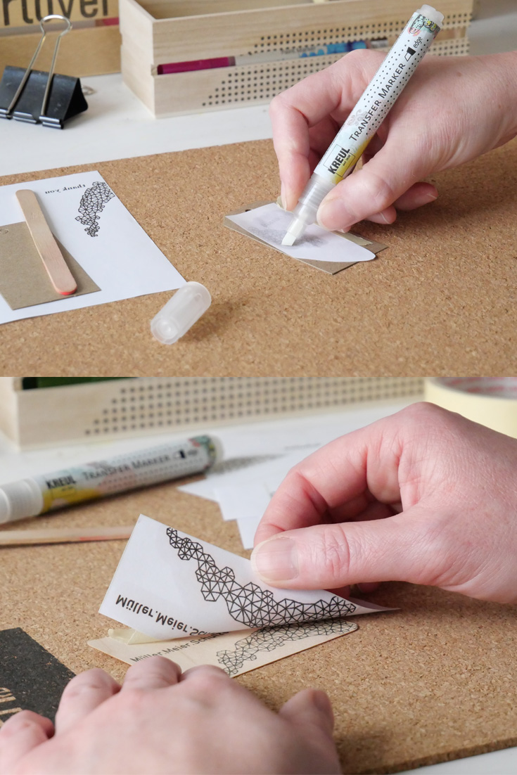 Εκτυπώστε το σχέδιο που θέλετε να μεταφέρετε σε χαρτί εκτύπωσης και τοποθετήστε το χαρτί με την εκτυπωμένη πλευρά προς τα κάτω ώστε να εφάπτεται με την επιφάνεια του αντικειμένου όπου θέλετε να μεταφερθεί το σχέδιο. Έπειτα περάστε μία στρώση από το KREUL Transfer Marker και πιέστε ομοιόμορφα με μια σπάτουλα. Το μελάνι απελευθερώνεται από το εκτυπωμένο χαρτί στο αντικείμενο. Έτοιμο!