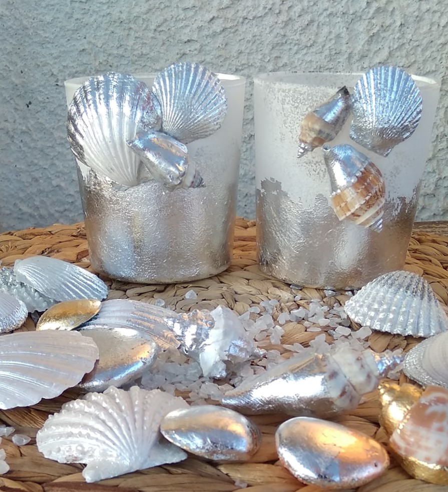 Ιδέες και συνθέσεις με κοχύλια & βότσαλα διακοσμημένα με φύλλα ασημιού