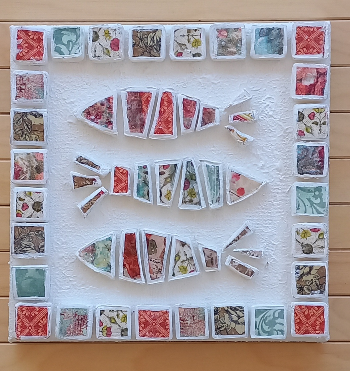 - Κολλάμε σταδιακά πάνω στα ψαράκια μικρά κομμάτια από χαρτοπετσέτες ή ριζόχαρτα με την κόλλα για decoupage.