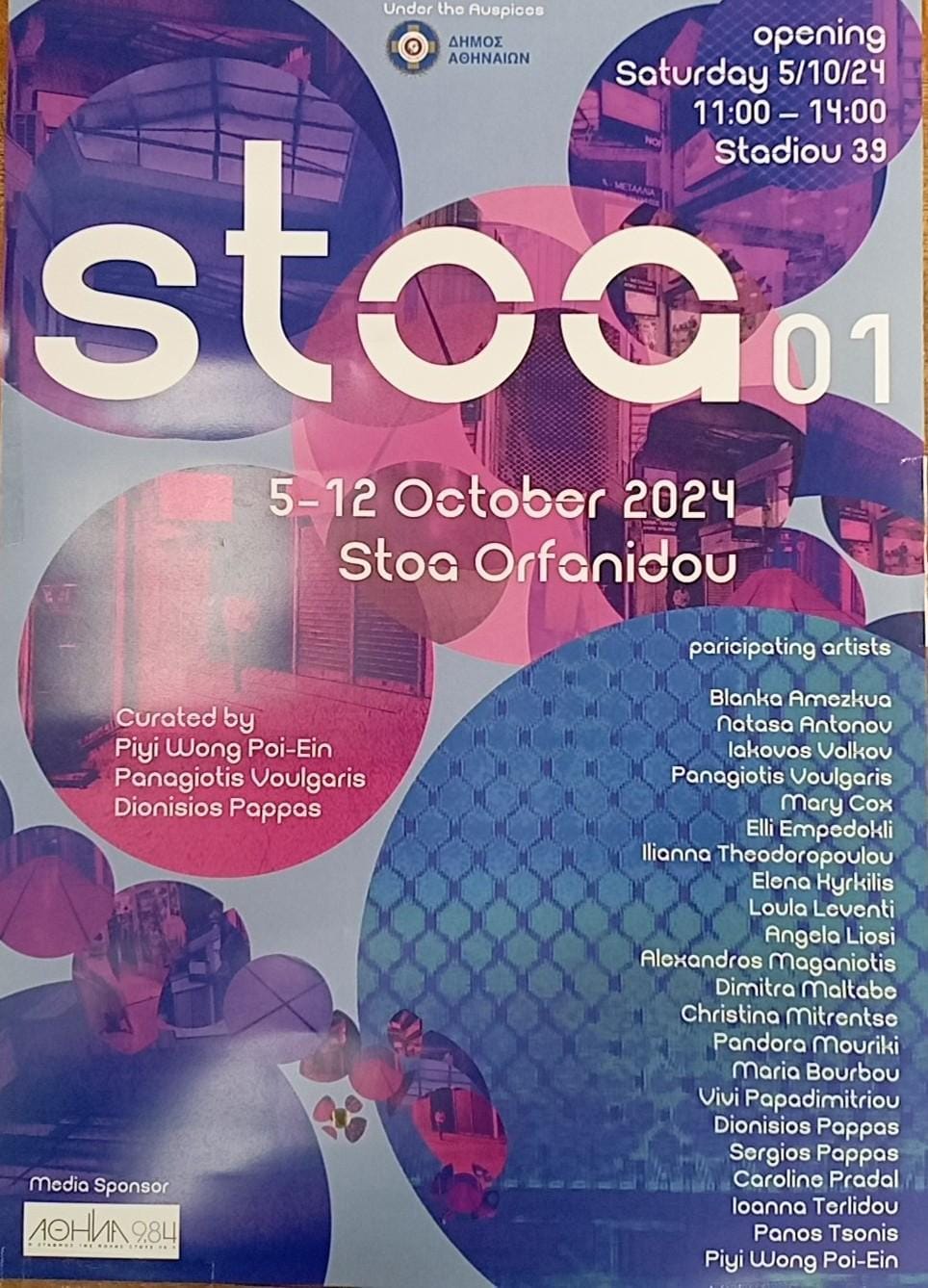 Η ομαδική έκθεση “Stoa 01” φιλοξενείται για μια εβδομάδα στην Στοά Ορφανίδου, την διαχρονική καρδιά της αγοράς συλλεκτικού νομίσματος και γραμματοσήμων, που σήμερα στεγάζει πολλά ετερόκλητα καταστήματα, αποτελώντας το πιο ζωντανό τμήμα ενός δικτύου γειτονικών στοών, συνδέοντας την πολύπαθη αλλά με σημάδια αναγέννησης Σταδίου με την πολύβουη Σοφοκλέους, το αλλοτινό κέντρο της οικονομίας.